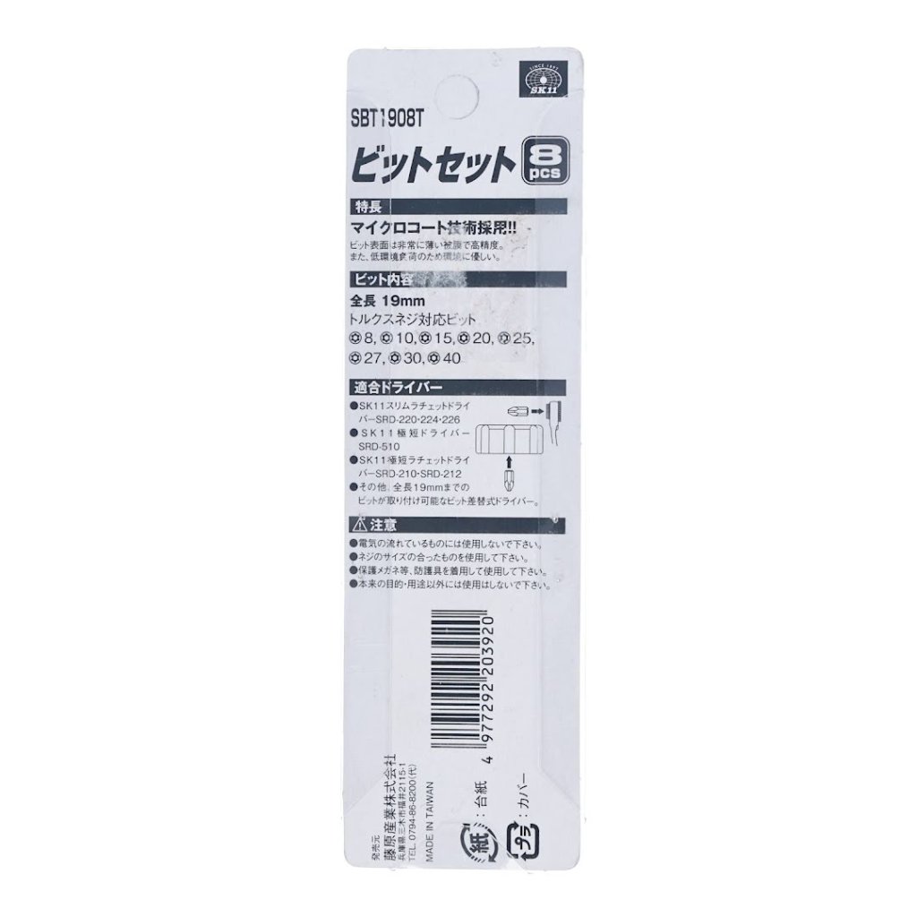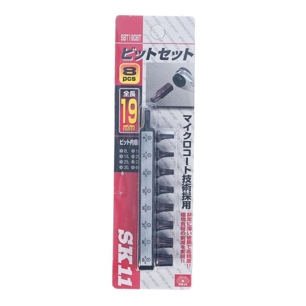 Sada bitů SK11, model SBT1908T, je všestranná pro utahování a uvolňování šroubů. Obsahuje 8 bitů různých velikostí: T8, T10, T15, T20, T25, T27, T30 a T40, každý o délce 19 mm. Bity jsou ošetřeny mikropovlakem pro vysokou přesnost a snížený dopad na životní prostředí. Kompaktní velikost (19x90x12mm) a lehkost (33g) z něj činí nezbytnou součást každé sady nářadí.