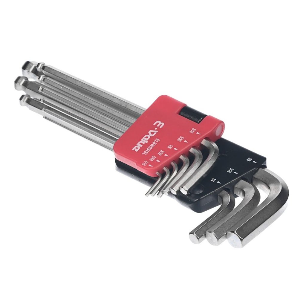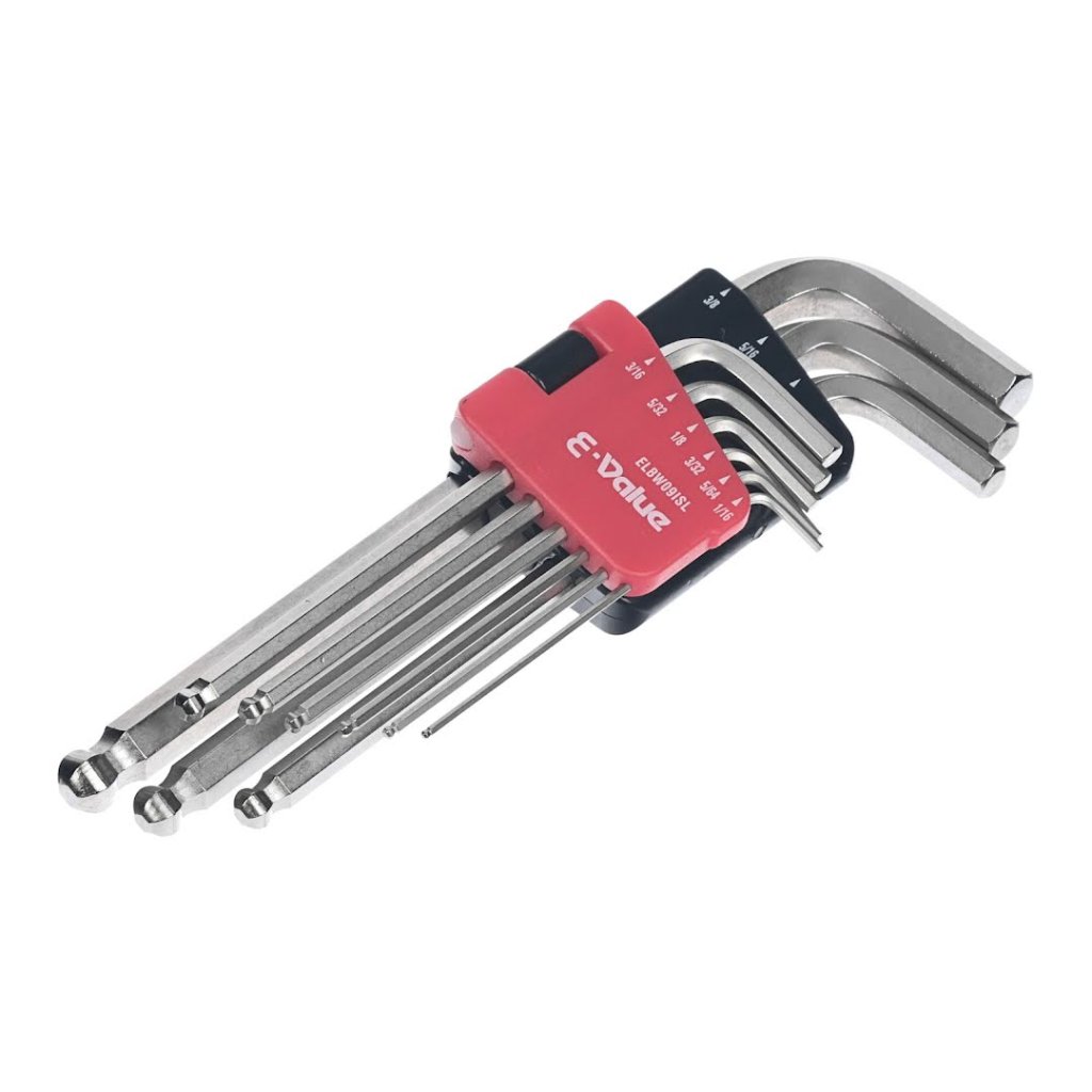 E-VALUE sada imbusových klíčů s kuličkovými konci, je navržena pro efektivitu a přístupnost při utahování a povolování šroubů s vnitřním šestihranem. Tato sada obsahuje kuličkový konec, který umožňuje pracovní úhel až 25 stupňů, který umožňuje práci v těsných nebo překážkami omezených oblastech. 175 mm délka každého klíče zvyšuje páku a dosah, zatímco kompaktní velikost zajišťuje snadné přenášení a skladování. Sada obsahuje velikosti od 1/16 do 3/8 palce a je uložena v praktickém pouzdru s vyklápěním pro rychlý přístup a organizaci.