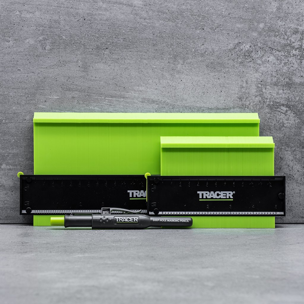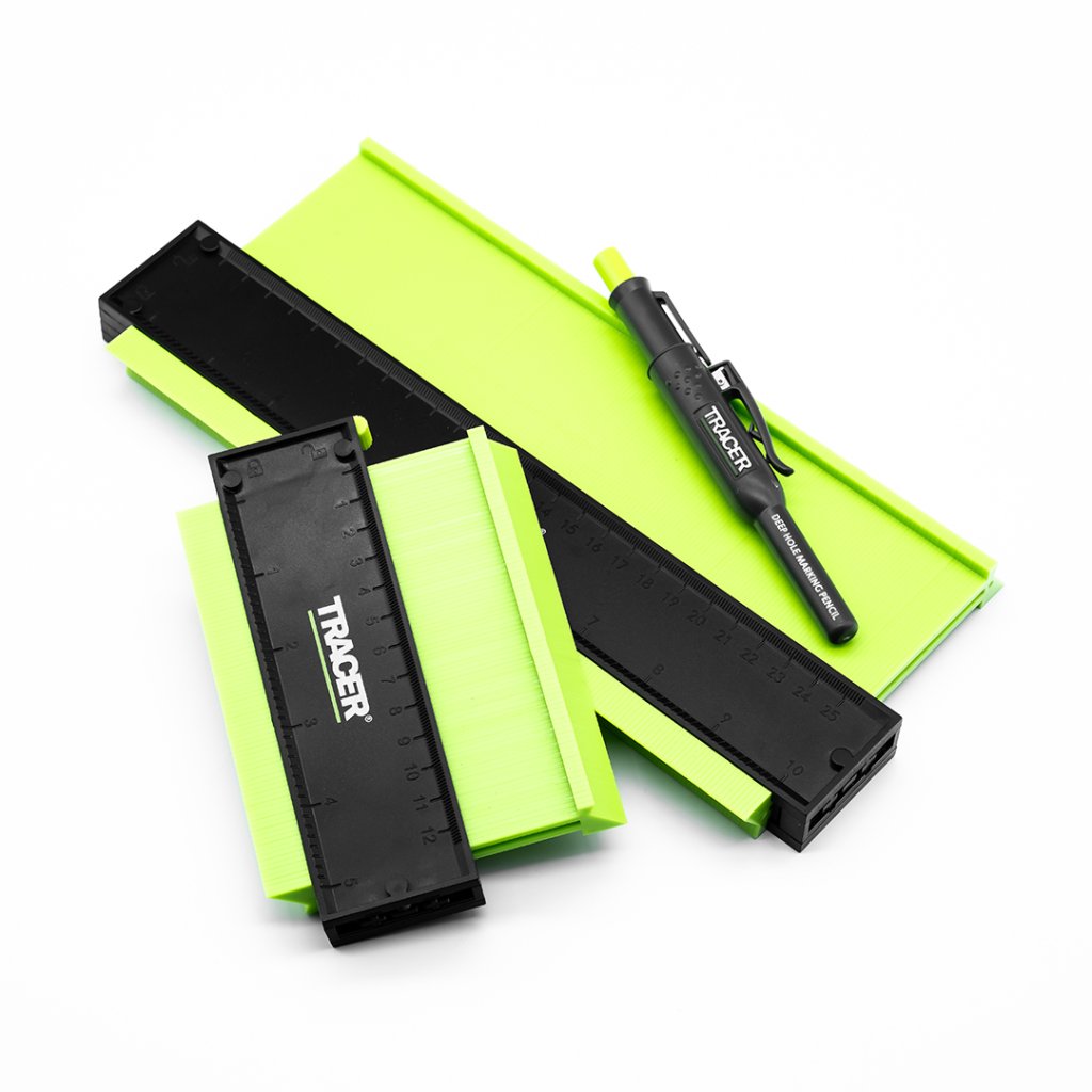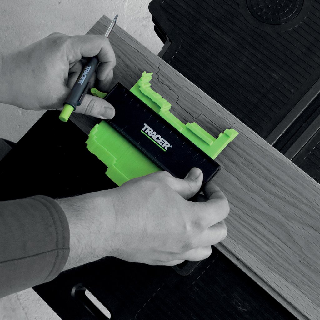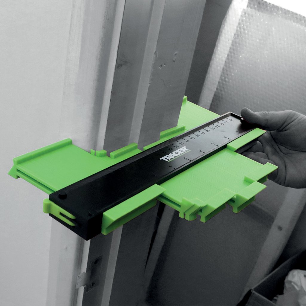 Pomocí kopírovací šablony TRACER snadno přenesete tvar rohů nebo zaoblení obložek futer na pokládaný koberec či plovoucí podlahu. Díky tomu podlahovou krytinu nařežete a položíte velmi přesně. Šikovná pomůcka pro obkladače, podláháře ale i pro karosáře.
