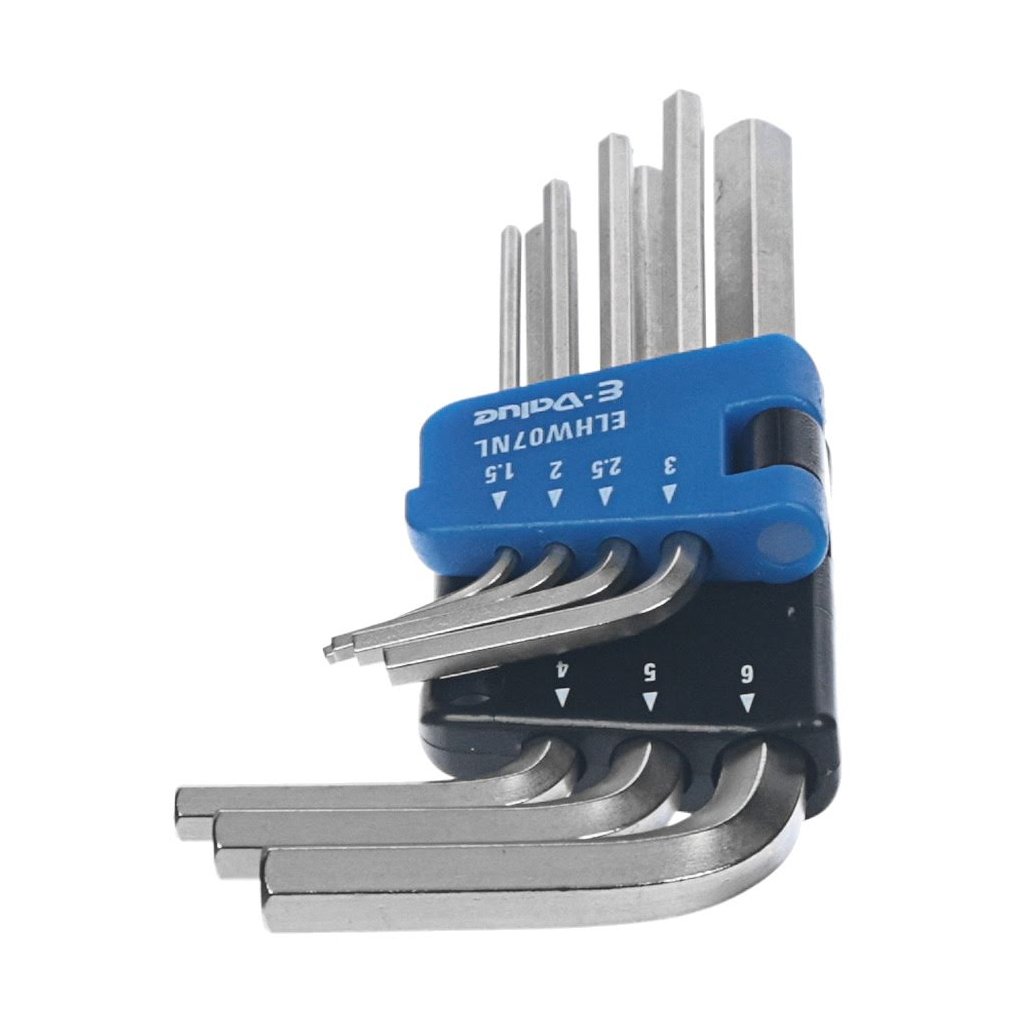 E-VALUE sada šestihranných klíčů ve tvaru L je standardní sada obsahující niklem potažené klíče, které jsou odolné proti korozi, což z ní činí vhodnou volbu pro jakoukoliv sadu nářadí. Tato sada má praktický rozkládací držák, který usnadňuje přenášení, skladování a přístup ke každému klíči. Sada je navržena pro utahování a povolování šroubů s šestihrannou hlavou, zahrnuje velikosti 1,5, 2, 2,5, 3, 4, 5 a 6 mm, což pokrývá širokou škálu potřeb.