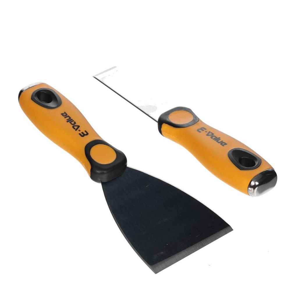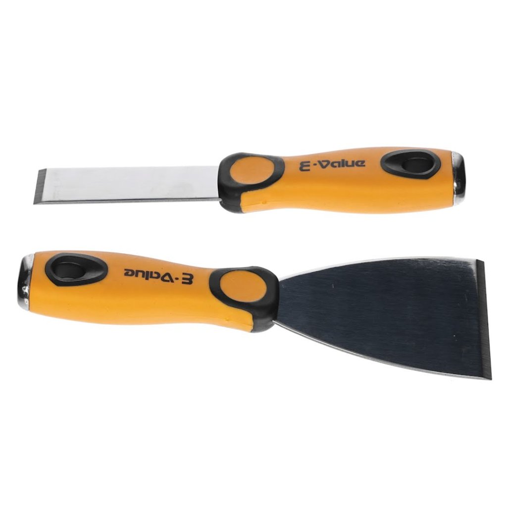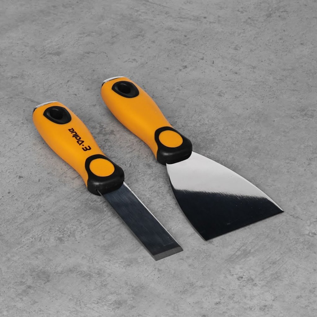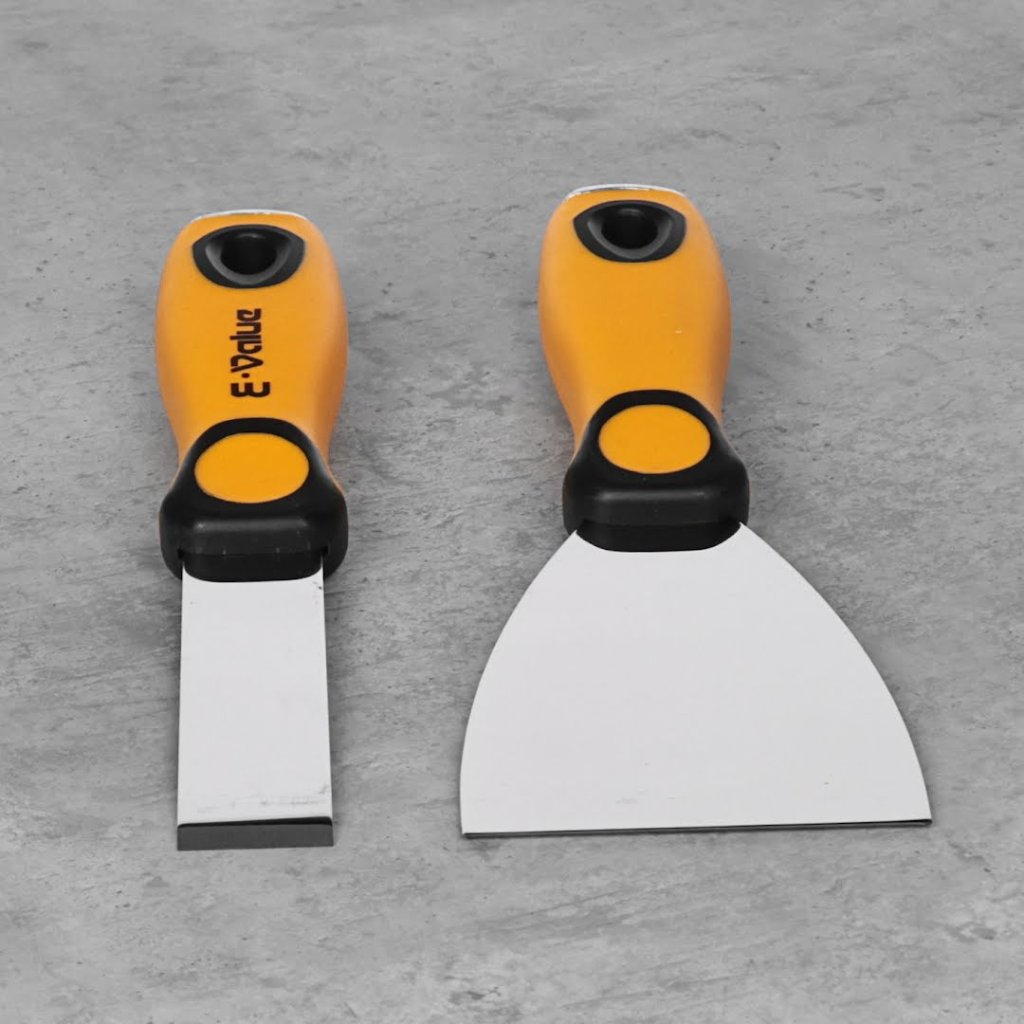 Sada nerezových špachtlí E-VALUE je navržena tak, aby snadno zvládla náročné úkoly. Díky extra silným nerezovým čepelím jsou tyto škrabky ideální pro odstraňování barvy, rzi a nečistot. Sada obsahuje dvě škrabky se šířkami čepelí 25 mm a 75 mm, což poskytuje všestrannost pro různé úkoly. Každá špachtle má pohodlnou, protiskluzovou, měkkou rukojeť, kterou lze udeřit kladivem pro zvýšení síly. Jejich kompaktní velikost a pevná konstrukce je činí spolehlivými pro náročné projekty v oblasti zednických projektů.