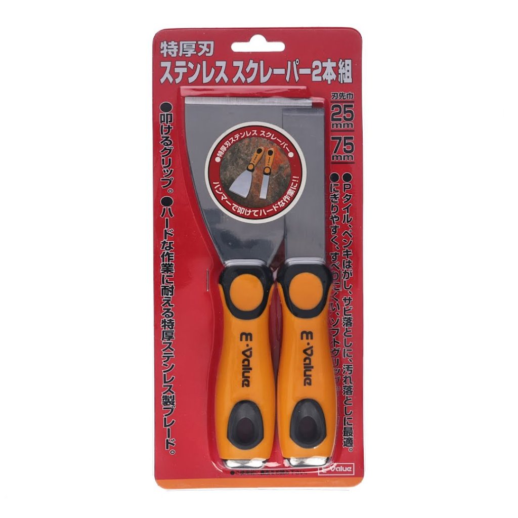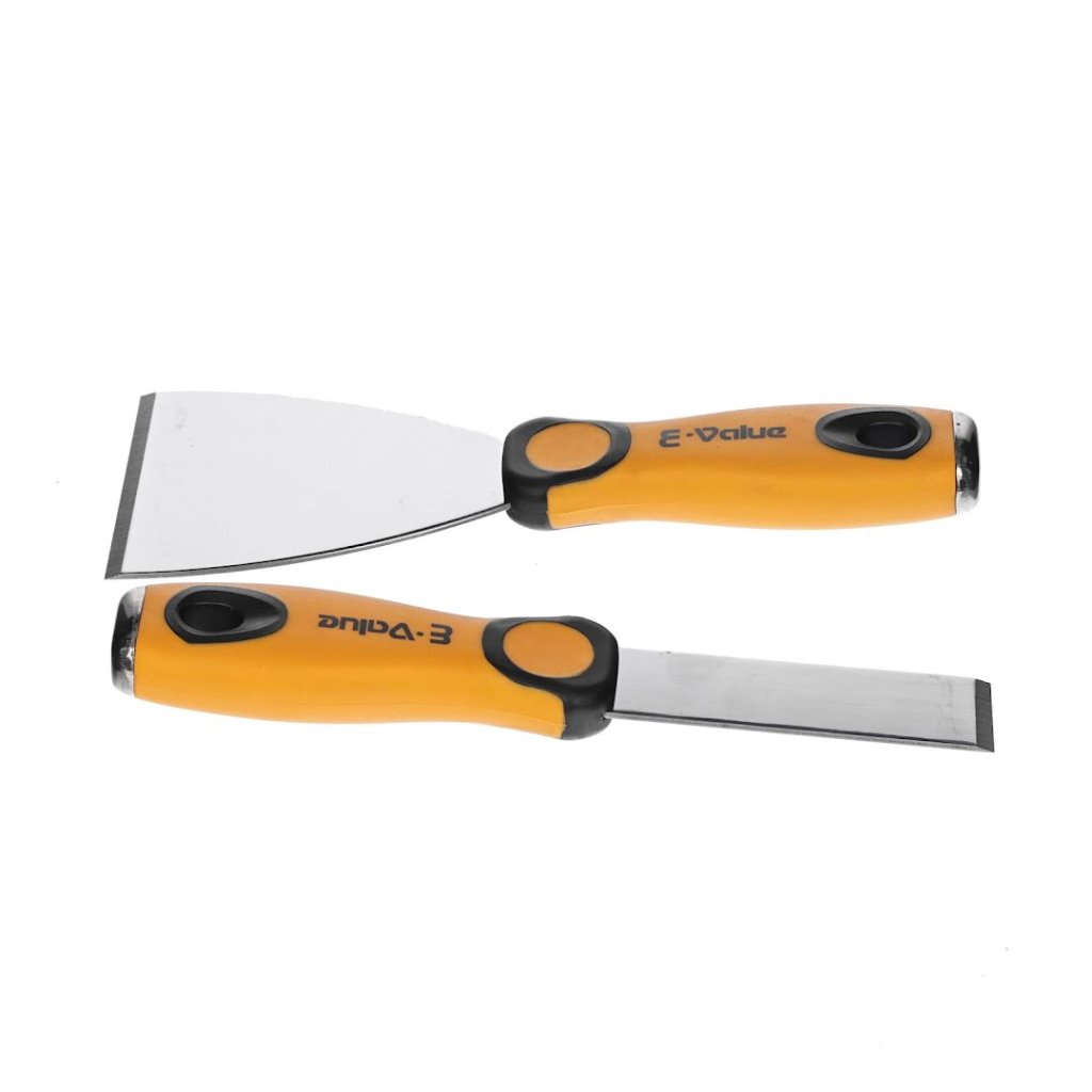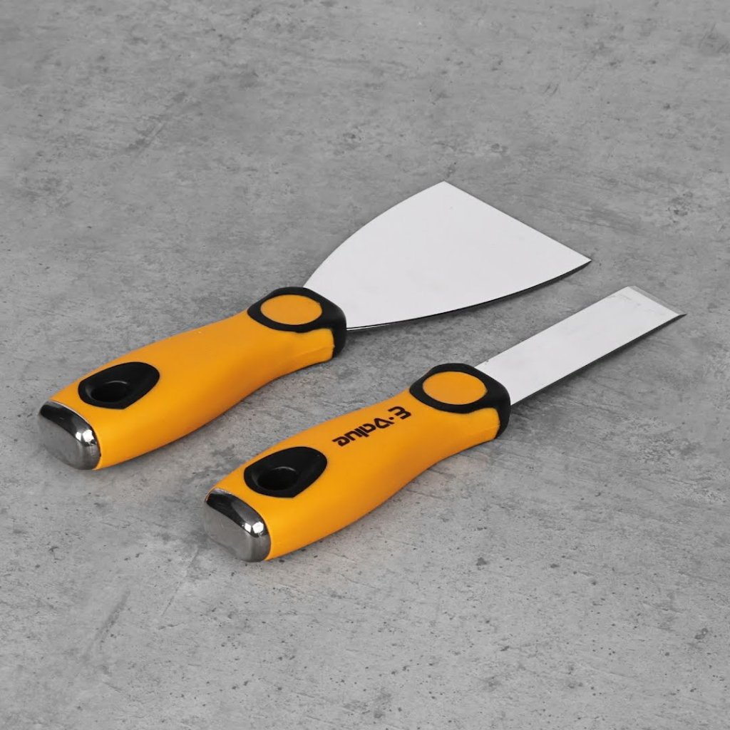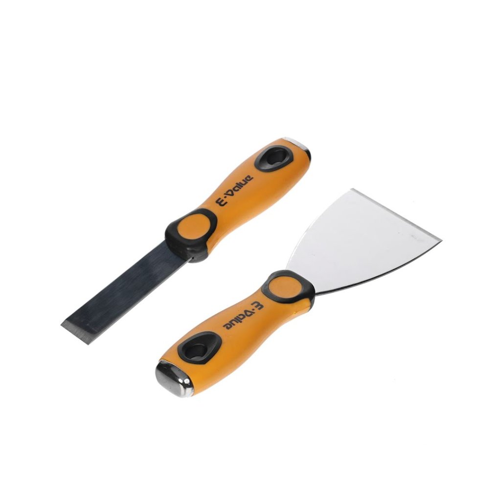 Sada nerezových špachtlí E-VALUE je navržena tak, aby snadno zvládla náročné úkoly. Díky extra silným nerezovým čepelím jsou tyto škrabky ideální pro odstraňování barvy, rzi a nečistot. Sada obsahuje dvě škrabky se šířkami čepelí 25 mm a 75 mm, což poskytuje všestrannost pro různé úkoly. Každá špachtle má pohodlnou, protiskluzovou, měkkou rukojeť, kterou lze udeřit kladivem pro zvýšení síly. Jejich kompaktní velikost a pevná konstrukce je činí spolehlivými pro náročné projekty v oblasti zednických projektů.