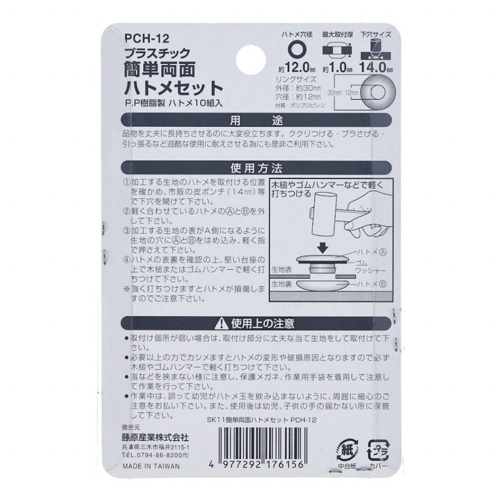 Sada oboustranných oček SK11 jsou navrženy pro snadnou instalaci pomocí několika úderů gumovou palicí nebo dřevěným kladivem. Tato korozi odolná plastová sada zvyšuje životnost vašich věcí a je ideální pro zesílení a opravy děr ve stanech a plachtách. Každá sada obsahuje deset párů oček, vhodných pro materiály až do tloušťky 1,0 mm, s požadovaným předvrtaným otvorem o velikosti 14,0 mm a průměrem otvoru očka přibližně 12,0 mm. Pro optimální instalaci používejte na silné tkaniny a aplikujte lehkou sílu, aby nedošlo k deformaci nebo poškození.