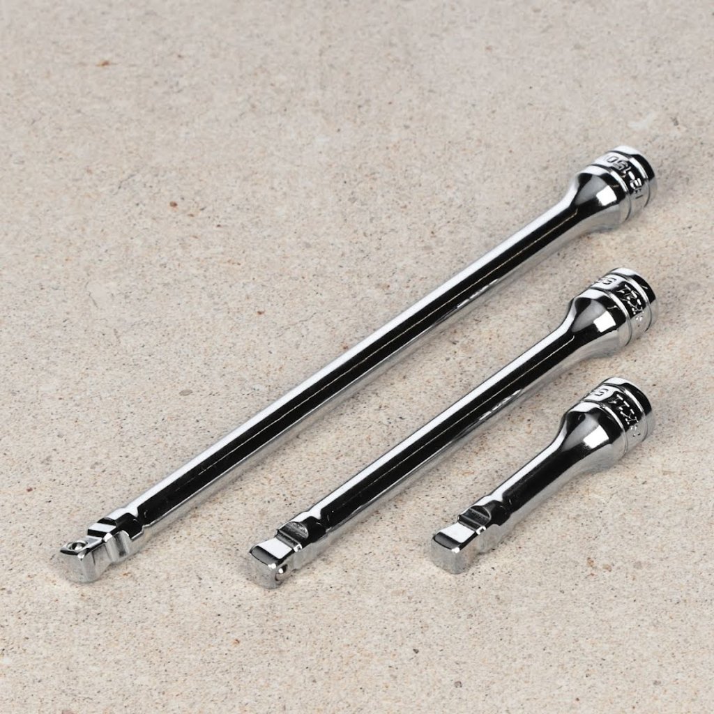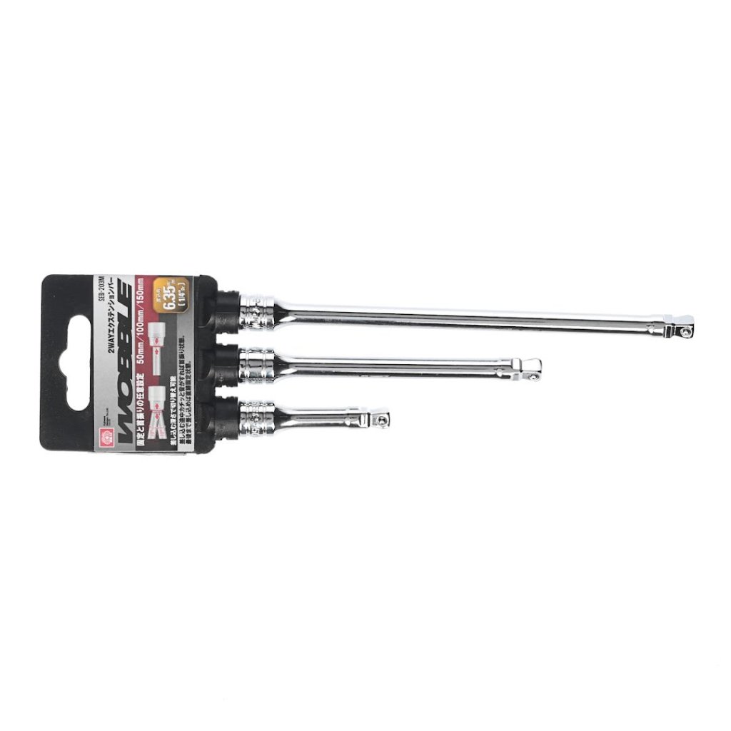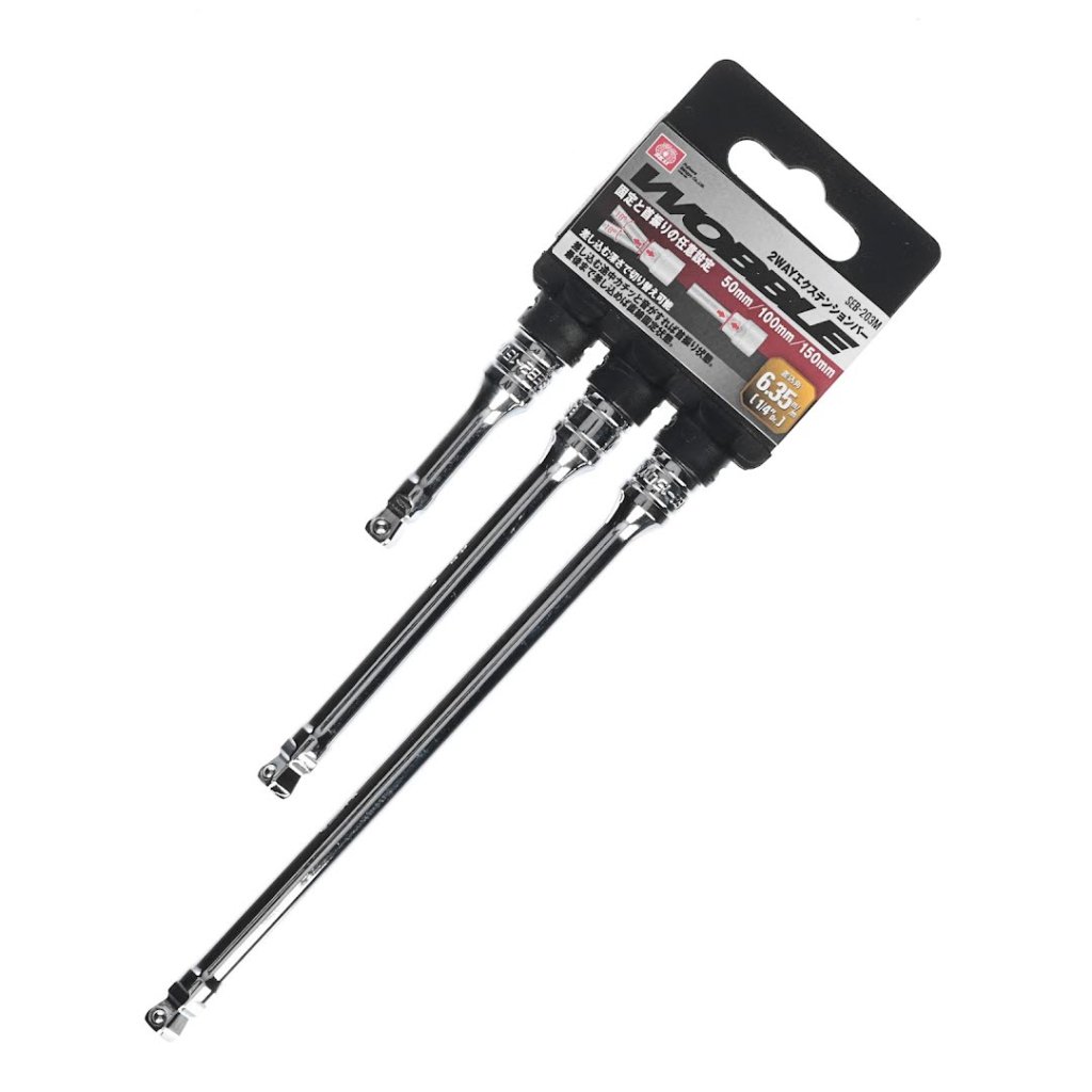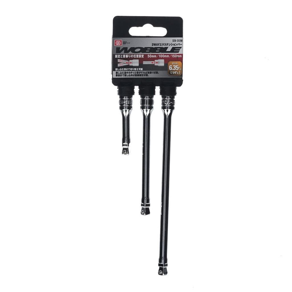 Sada prodlužovacích adaptérů SK11, model SEB-203M, je univerzální sada nástrojů navržená k zajištění dosahu v úzkých a hlubokých oblastech. Prodlužovací tyče lze nastavit do otočných a pevných poloh, což nabízí flexibilitu s úhlem otáčení 10 stupňů. Mají 6,35 mm (1/4 palce) pohon a jsou ideální pro různé aplikace s nástrčnými klíči. Tyče se pyšní pochromovaným zrcadlovým povrchem, který zajišťuje odolnost a elegantní vzhled. Obsahuje adaptéry o délkách 50 mm, 100 mm a 150 mm.