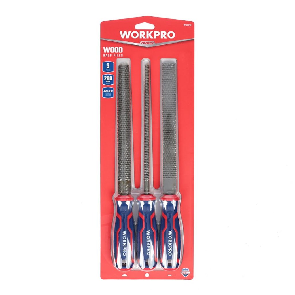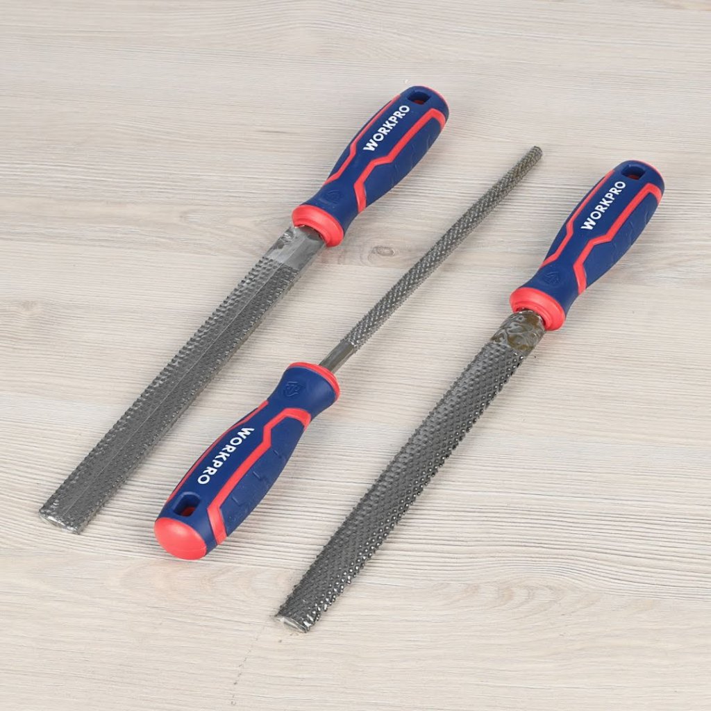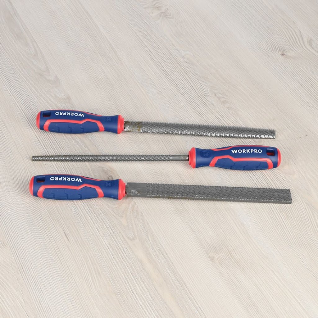 Rašple WORKPRO na opracování dřeva. 3 pilníky v sadě s různými profily. Vhodné pro profesionální i domácí využití.