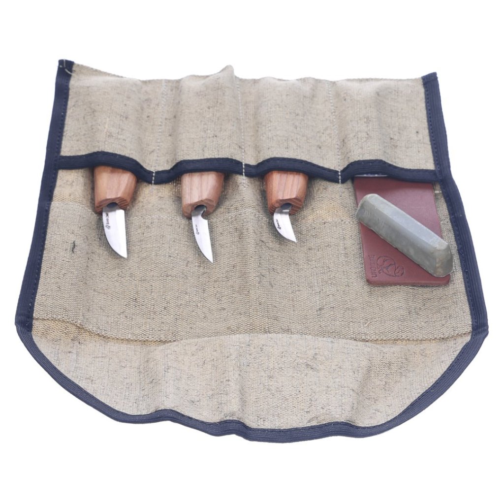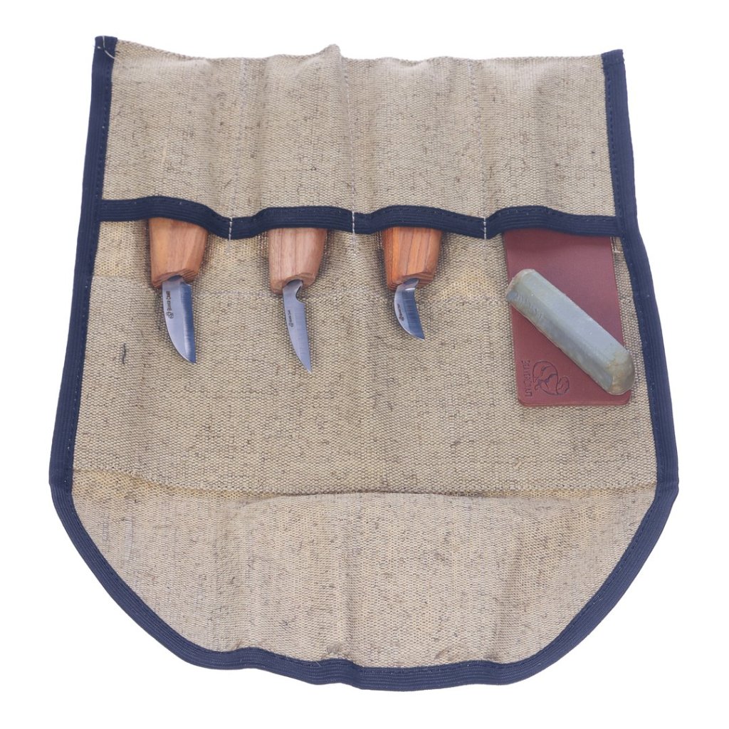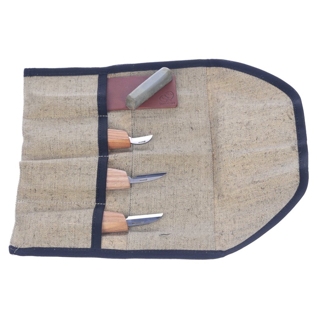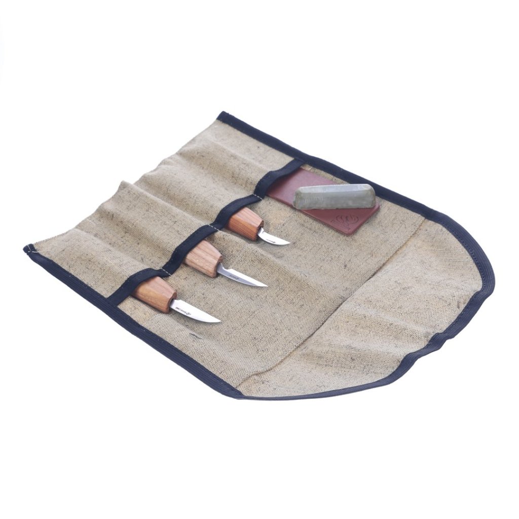 Sada obsahuje lžícový, odřezávací, detailový a malý řezbářský nůž BEAVERCRAFT. Nástroje jsou zabaleny v nástrojovém svitku, aby nedošlo k nežádoucímu opotřebení.