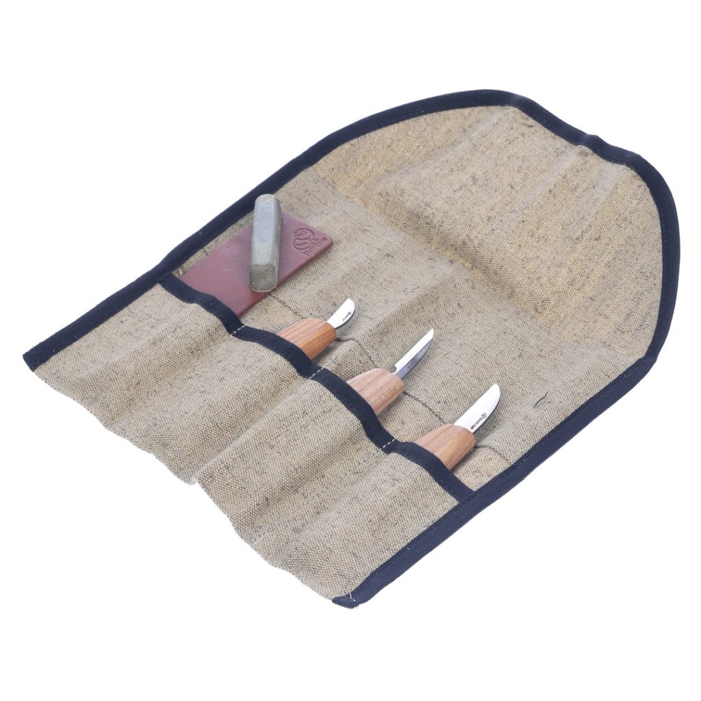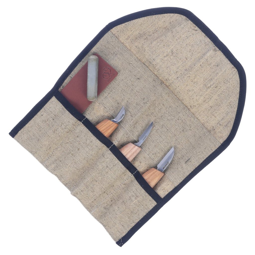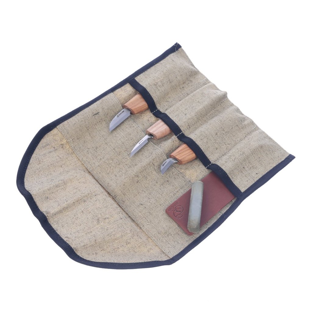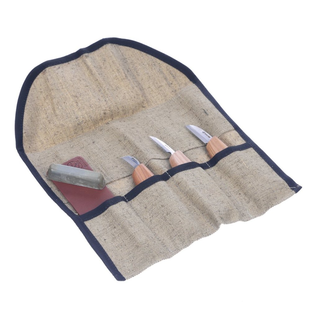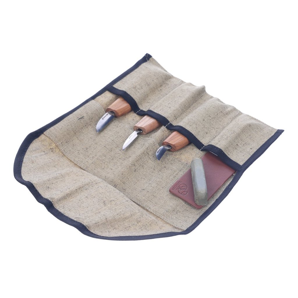 Sada obsahuje lžícový, odřezávací, detailový a malý řezbářský nůž BEAVERCRAFT. Nástroje jsou zabaleny v nástrojovém svitku, aby nedošlo k nežádoucímu opotřebení.