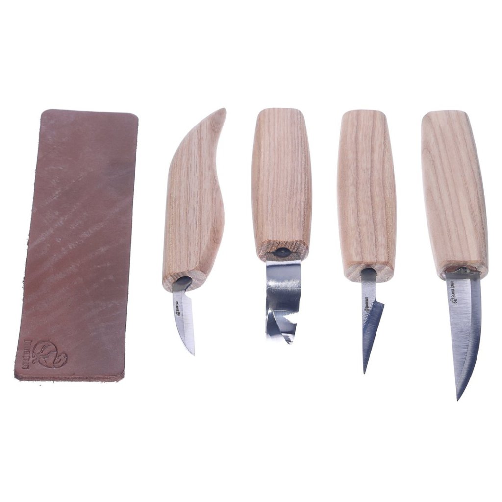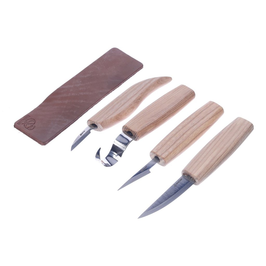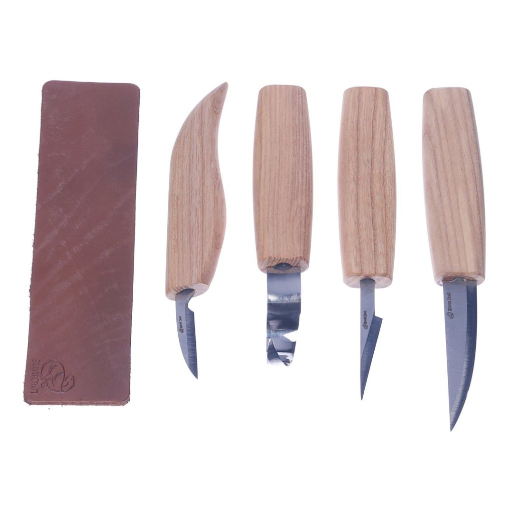 Sada obsahuje lžícový, odřezávací, detailový a malý řezbářský nůž BEAVERCRAFT. Nástroje jsou zabaleny v nástrojovém svitku, aby nedošlo k nežádoucímu opotřebení.