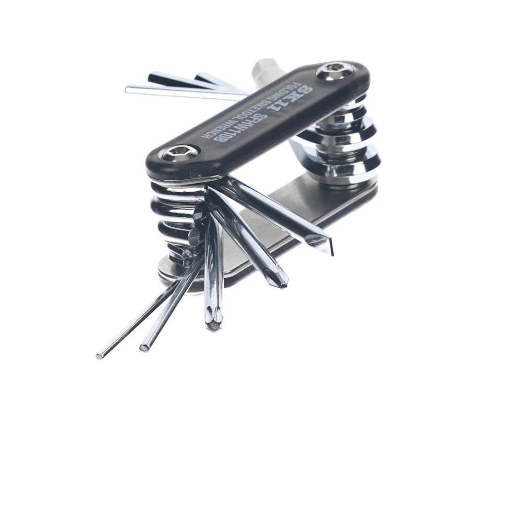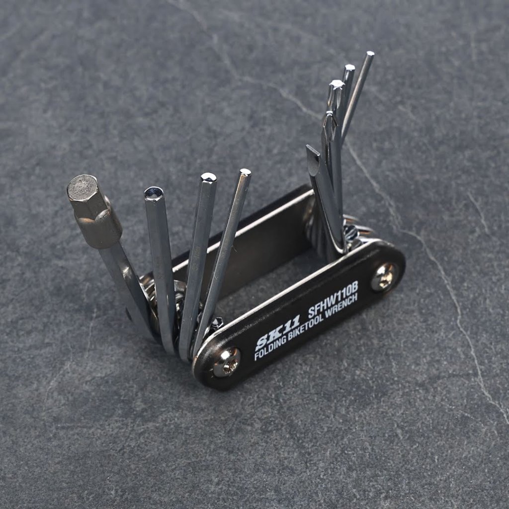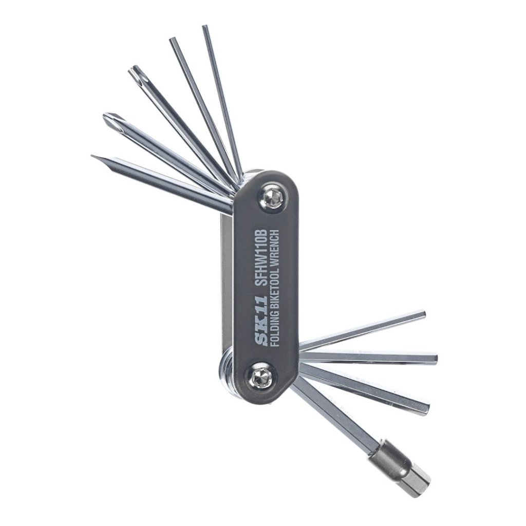 Skládací sada imbusových klíčů SK11, model SFHW110B, je přenosný a skládací nástroj ideální pro utahování a povolování různých šroubů a matic. Klíče lze nastavit na libovolný požadovaný úhel podle vašich pracovních potřeb. Rukojeť slouží zároveň jako úložné pouzdro, což usnadňuje přenášení. Tato sada obsahuje deset kusů, což je ideální pro údržbu jízdních kol a další kutilské práce.