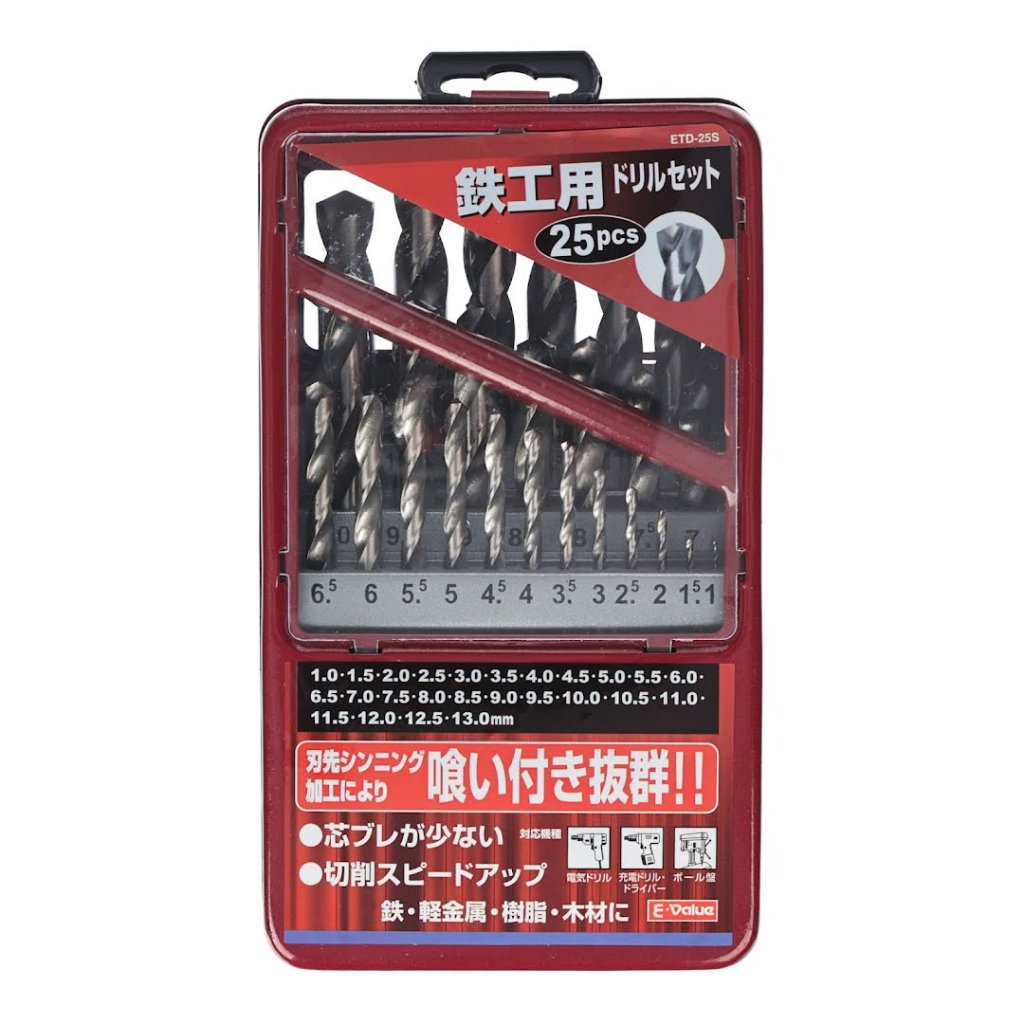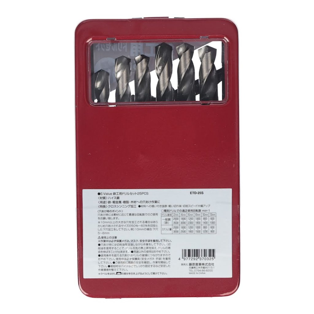 Sada vrtáků E-VALUE, model ETD-25S, nabízí přesnost a efektivitu pro vrtání do kovu. Zahrnuje 25 vrtáků navržených pro obecné vrtání oceli. Řezání špiček vrtáků zajišťuje vynikající záběr do materiálu a minimalizuje vychýlení. Kompatibilní s elektrickými, akumulátorovými a stojanovými vrtačkami, je tato sada spolehlivou volbou pro jakýkoliv kutilský nebo profesionální projekt.
