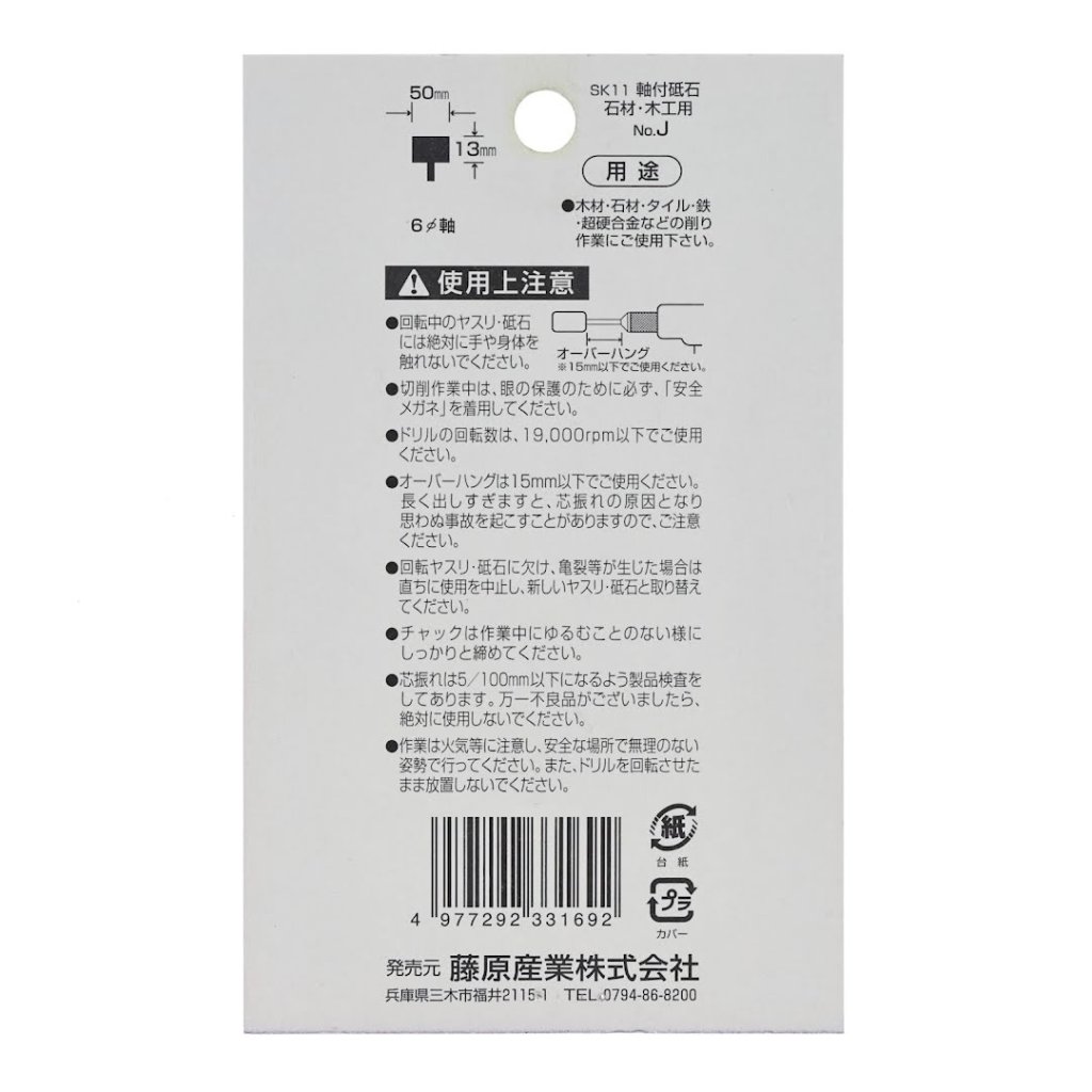 Kotoučový brusný kámen SK11 No.J je navržen pro dřevoobrábění, kámen, dlaždice, železo a karbidové slitiny. Ideální pro použití s elektrickými vrtačkami a pneumatickými bruskami, má stopku o průměru 6 mm a šířku brusné části 50 mm. Zajistěte převis 15 mm nebo méně a používejte při otáčkách pod 19000 ot/min.