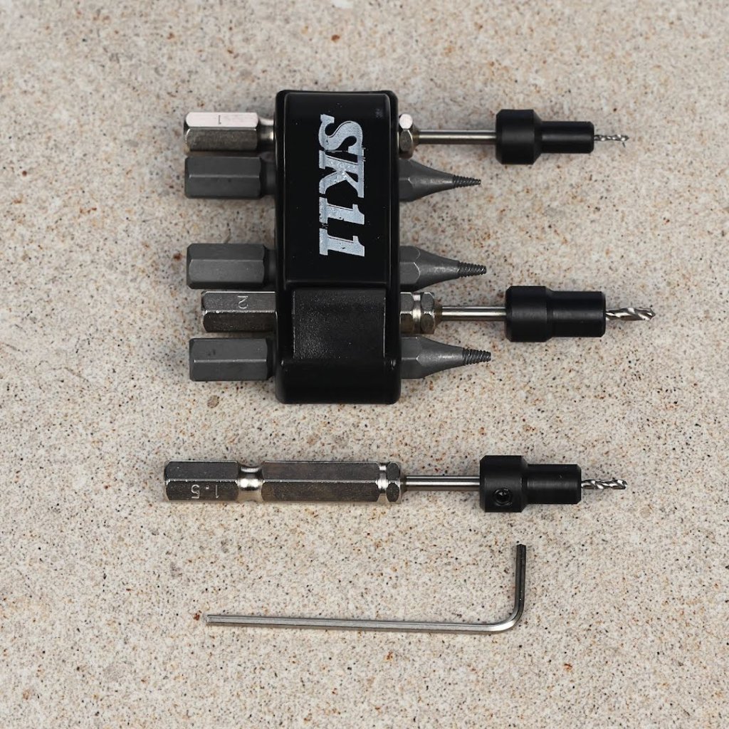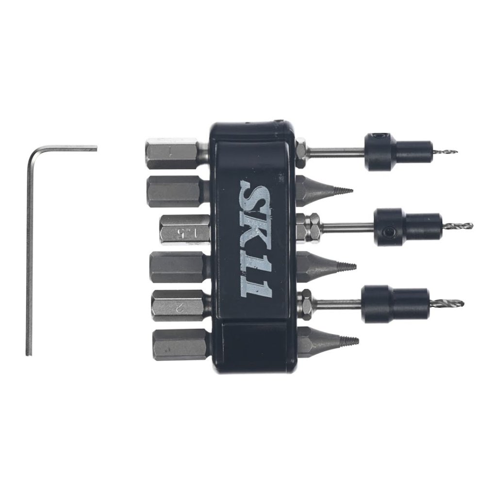 Sada na vyjímání šroubů SK11 je navržena pro efektivní odstranění poškozených šroubů ze dřeva. Tato sada obsahuje tři bity, z nichž každý je schopen jak vrtání pilotních děr, tak vyjímání šroubů o průměrech v rozmezí 1,6 mm až 4,5 mm. Vhodné pro použití s elektrickými vrtačkami s předním i zpětným chodem, poskytuje všestranné řešení pro různé potřeby vyjímání šroubů.
