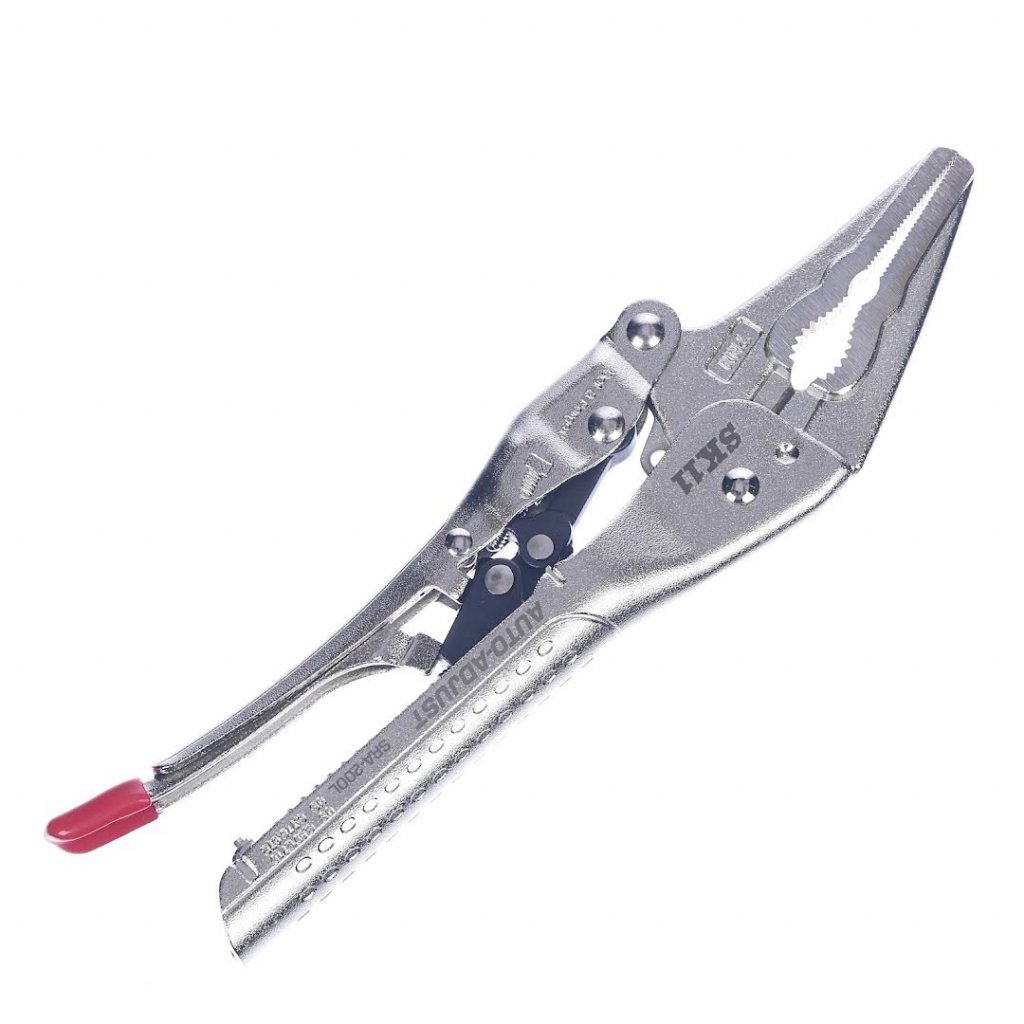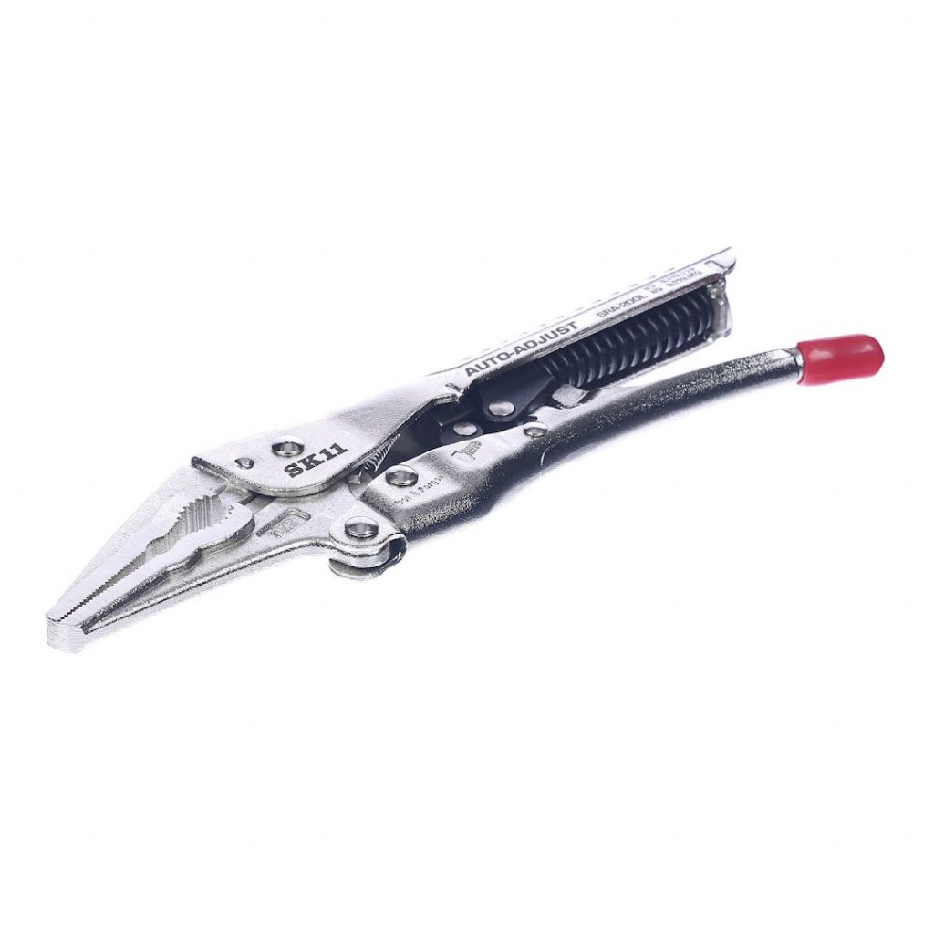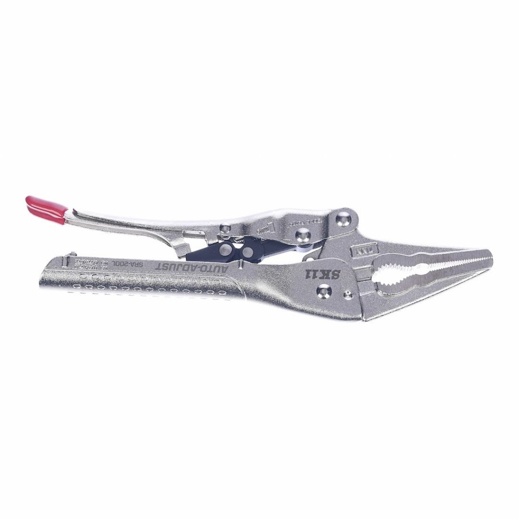 Samosvorné kleště SK11 s dlouhými čelistmi, model SRA-200L, zjednodušují vaše úkoly díky mechanismu automatického nastavení, který nevyžaduje žádné předběžné nastavení pro tloušťku, což je ideální pro různé úkony svírání. Jejich dlouhý design čelistí umožňuje snadný přístup do úzkých prostor, ideální pro uchopení a otáčení malých šroubů nebo matic. S rozměry 50 mm na šířku, 19 mm na výšku a 202 mm do hloubky a s hmotností 287 g nabízí tento nástroj maximální otevření 51 mm. Pro úkoly vyžadující vyšší svírací sílu zvažte použití tradičních svěrací kleští s nastavením. Nepoužívejte jako zdvihací zařízení.