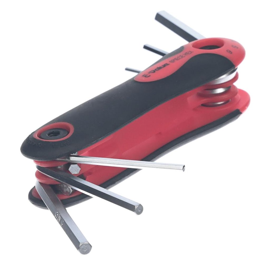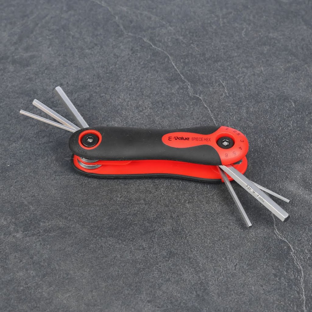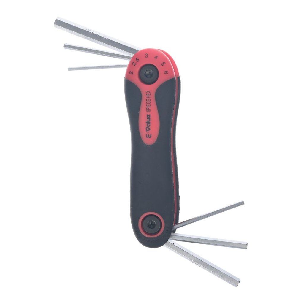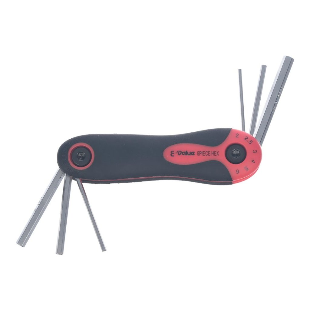 Sada imbusových klíčů E-VALUE, model EHK-3, je všestranný nástroj pro utahování a povolování šestihranných šroubů. Tato sada obsahuje šest velikostí (2, 2.5, 3, 4, 5, 6 mm) pro různé úkoly. Díky skládacímu designu ve stylu nože je kompaktní a snadno přenosná, zatímco ergonomická rukojeť zajišťuje pohodlí při používání. Tato sada imbusových klíčů je spolehlivým doplňkem každé sady nářadí a je ideální pro profesionály i domácí kutily.