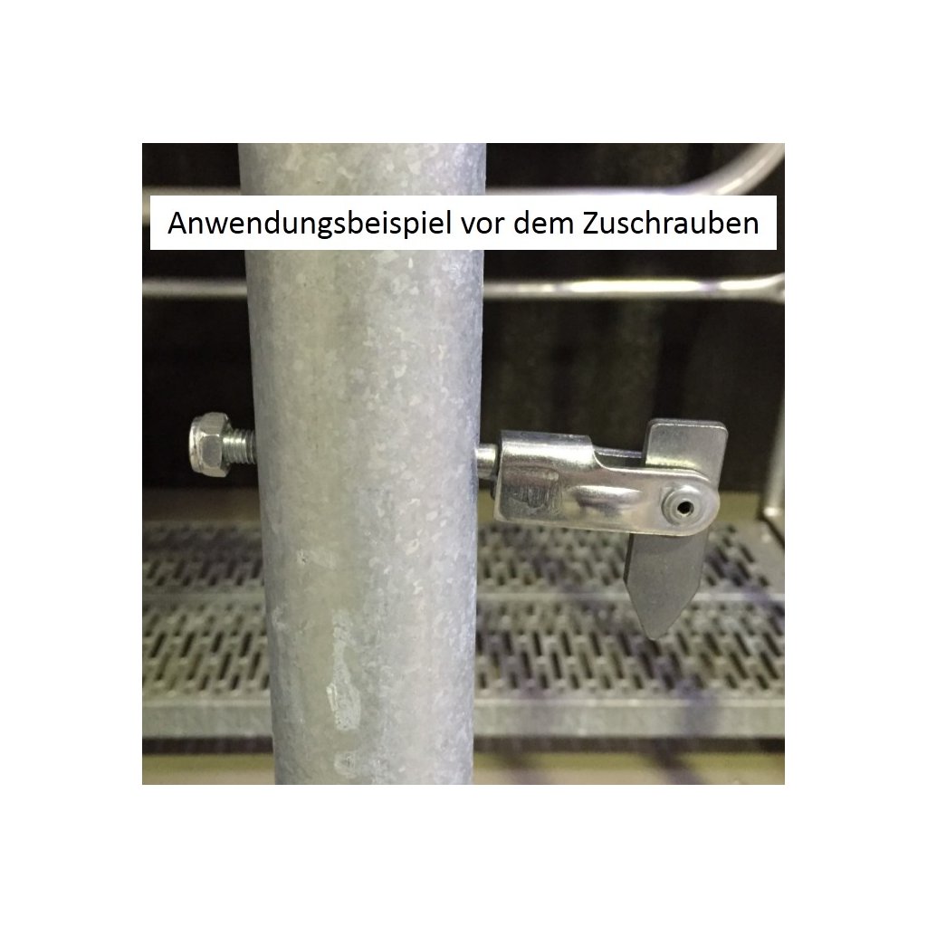 Montuje se do vertikálních rámů RUX SUPER jako dodatečný úchyt pro montáž zábradlí na vnitřní straně lešení. Vnitřní stojiny vertikálních rámů RUX SUPER mají předvrtané otvory určené pro montáž těchto dodatečných čepů. Montáž je jednoduchá - zasunout do předvrtaného otvoru v rámu a utáhnout samojistící matici, která je součástí dodávky. Tento díl je možné použít i pro systémy lešení jiných výrobců s technologií sklopných čepů.