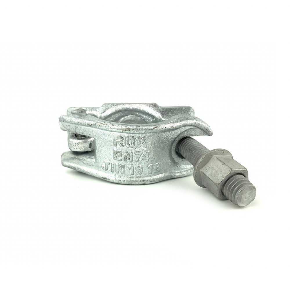 Našroubovací spojka značky Scafom RUX slouží ke spojení trubky o průměru 48,3 mm s konstrukcí prostřednictvím šroubového spoje. Rychlozávit šroubů je samočistící a umožňuje velmi rychlé utahování a povolování matic. Spojka je vyrobená z velmi kvalitní žárově pozinkované ocele, která nerezne, je certifikovaná, označena názvem výrobce a číslem certifikátu. Vyrobeno v Německu.