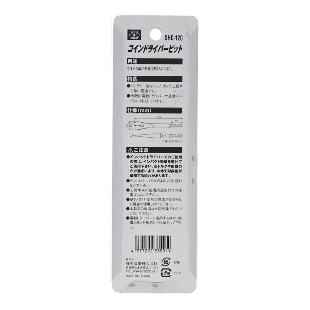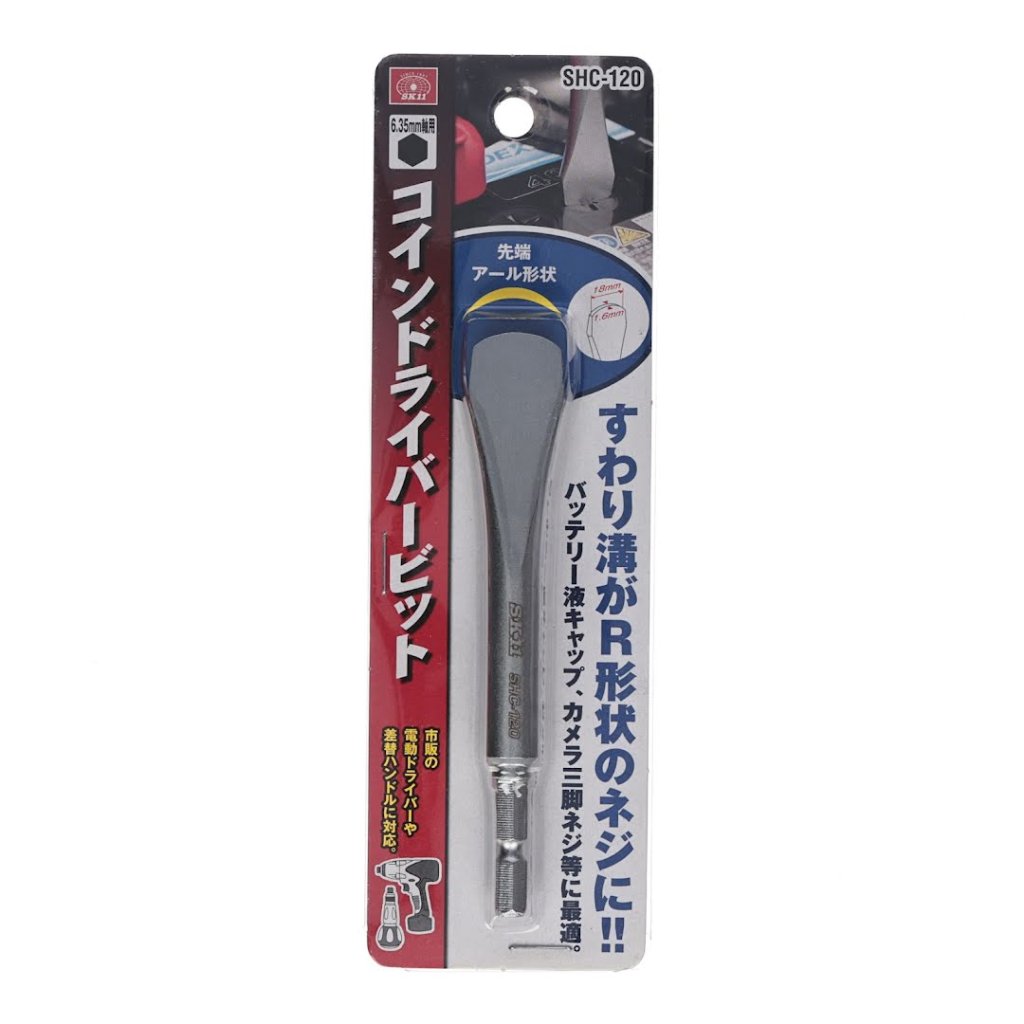 Šroubovací nástavec SK11, model SHC-120, je všestranný nástroj pro odstranění krytek baterií a dalších komponentů. Navržen pro připojení k elektrické vrtačce, tento bit účinně zvládá šrouby, které je obtížné odstranit kvůli rezavosti nebo pevnosti. Speciálně navrženo pro "coin slot" šrouby (šrouby s drážkou jako na minci). Je ideální pro šrouby, které se nacházejí v krytech kapaliny baterií a šroubech stativů kamer. 18 mm zaoblený hrot a 1,6 mm tloušťka zajišťují přesné usazení, zatímco 6,35 mm šestihranná stopka umožňuje kompatibilitu se standardními elektrickými šroubováky a vyměnitelnými rukojeťmi.