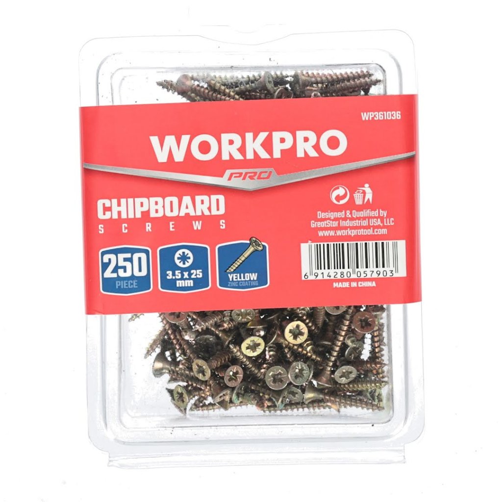 Šrouby WORKPRO určené na dřevotřísku, dřevo, překližku a OSB desky. Šrouby obsahují zápustku, aby po zavrtání nevyčnívali, čímž zlepší estetiku materiálu a zabrání nechtěnému vytrhnutí. Balení obsahuje 250 ks kovových šroubů s rozměry 3,5x25 mm.