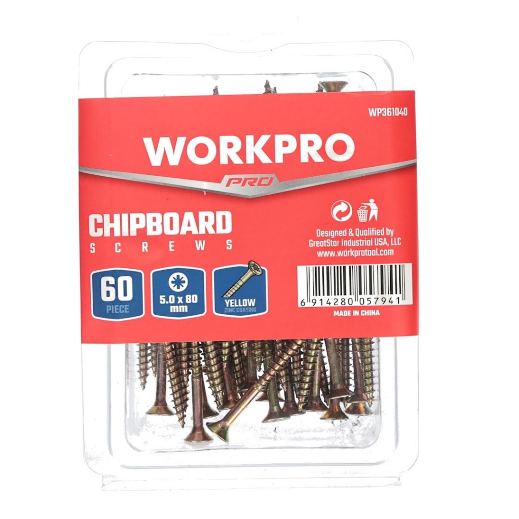 Šrouby WORKPRO určené na dřevotřísku, dřevo, překližku a OSB desky. Šrouby obsahují zápustku, aby po zavrtání nevyčnívali, čímž zlepší estetiku materiálu a zabrání nechtěnému vytrhnutí. Balení obsahuje 60 ks kovových šroubů s rozměry 5x80 mm.