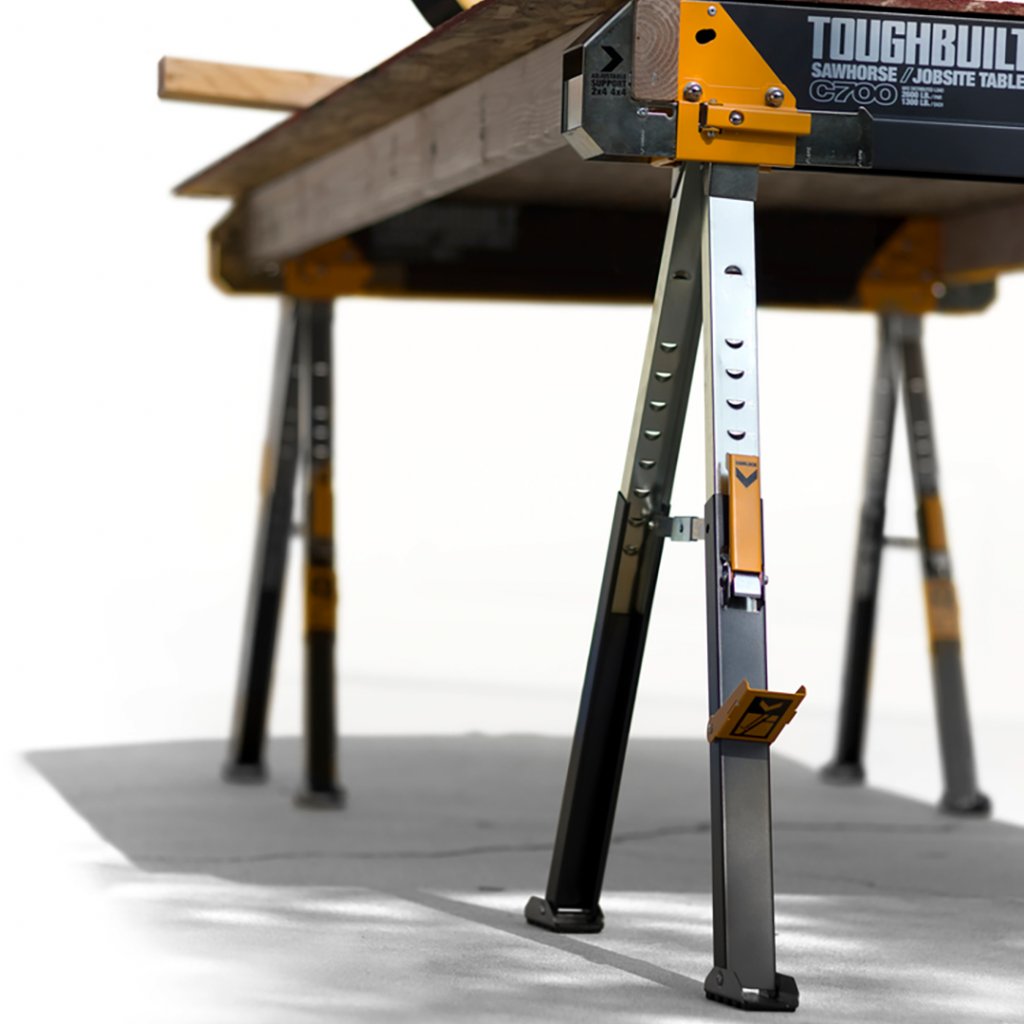 Skládací stavební koza americké značky TOUGHBUILT typ C700 je nejlepší model z řady stavebních koz od výrobce TOUGHBUILT. Tento model je výškově nastavitelný. Oproti menším modelům má další vylepšení, jako jsou například sklopné, otočné, výškově nastavitelné nožky opatřené protiskluzovým povrchem. Okrajové úchyty (držáky) pro zasunutí dřeva jsou nastavitelné do šířky rychloupínačem. Praktické jsou i další sklopné držáky pro uchycení trámků, či dalšího materiálu. Stejný jako u všech modelů je zde praktický skládací mechanismus, který umožní perfektní manipulaci s touto stavební kozou. Povrch je natřen práškovou barvou a je pozinkovaný a je tedy velice odolný proti korozi a odření. Z vrchu kozy je protiskluzový pruh. Konstrukce pracovní kozy je z ocele. Nosnost páru je až 1 180 kg. V horní části stavební kozy je zapuštěná praktická rukojeť, která Vám usnadní přenášení pracovní kozy z místa na místo. Skládací stavební koza americké značky TOUGHBUILT typ C700 je nejen praktická a kvalitní, ale má i pěkný design.