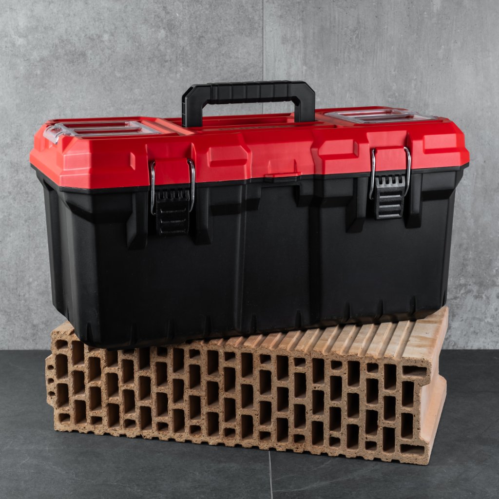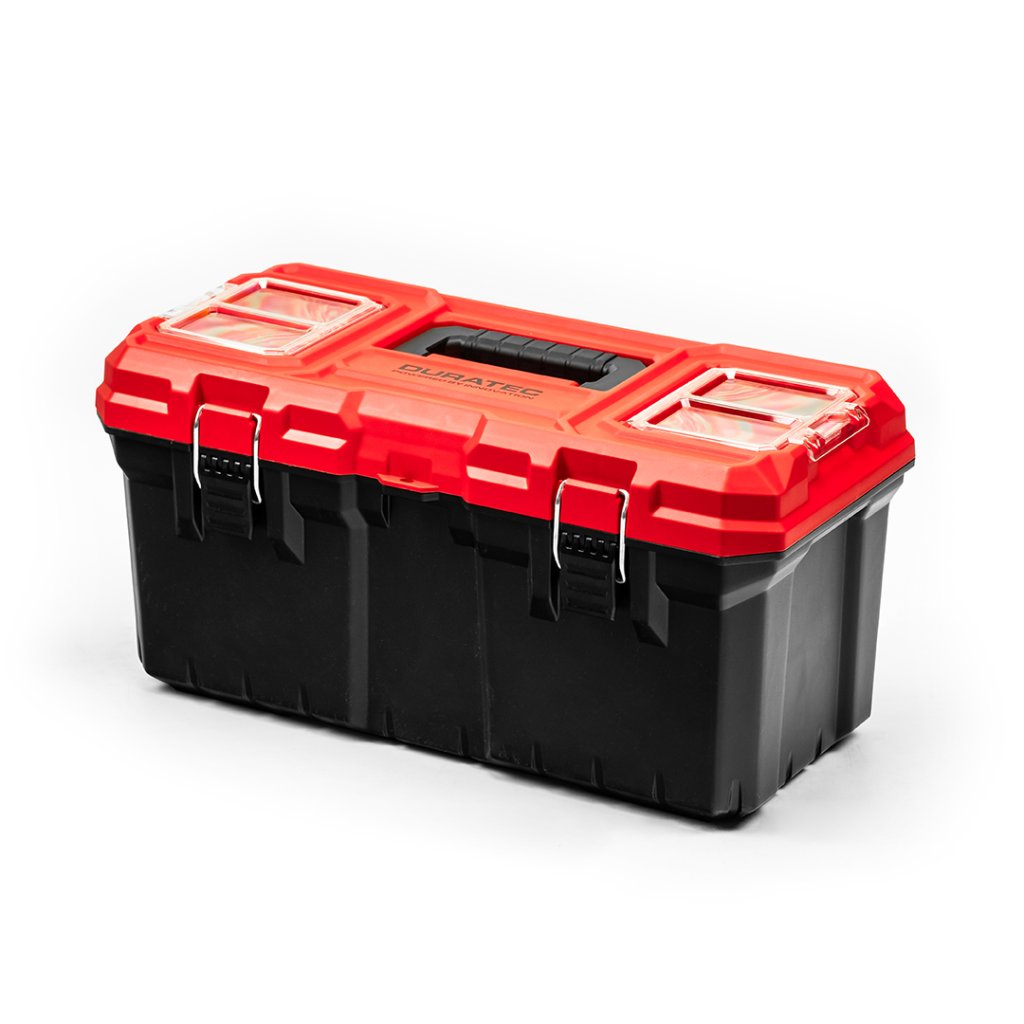 Uložit a přenést nářadí či jiný potřebný materiál. K tomu je určený box na nářadí DURATEC. Odolný při pádu z výšky. Uzavíratelný na dvě kovové petlice a s možností celý box uzamknout visacím zámkem.