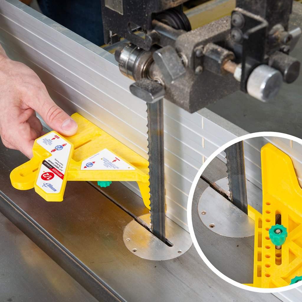 - Nastavte polohu zarážky proti pilovému listu a řezejte materiál na pásové pile bez zbytečných dohadů.