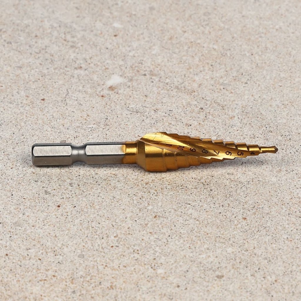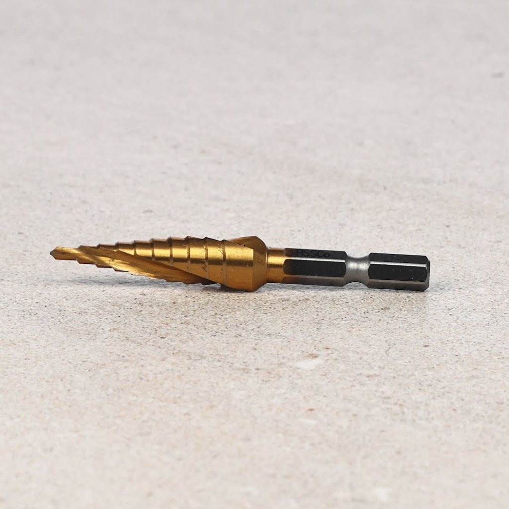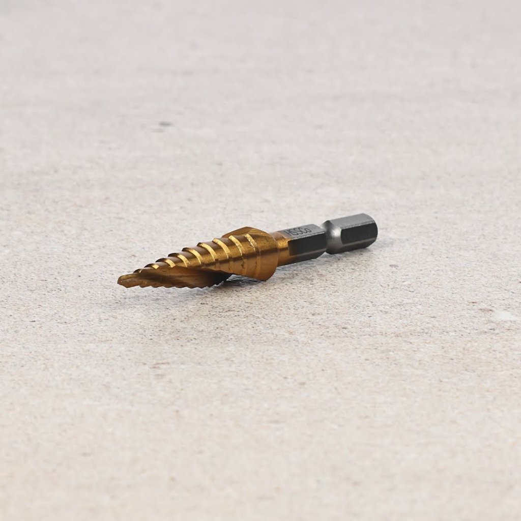 Titanem potažený stupňovitý vrták SK11, model SSD-4, je navržen pro efektivní vrtání v tenkých ocelových plechách a hliníku. Jeho unikátní spirálový design drážek zajišťuje vynikající odvod třísek a rychlé vrtací rychlosti. Titanový povlak poskytuje vynikající odolnost vůči teplu a dlouhou životnost. Tento vrták je ideální pro použití s akumulátorovými rázovými utahováky a vrtačkami, nabízí snížený řezný odpor a zlepšenou efektivitu baterie. Vhodný pro zvětšování otvorů a odstraňování otřepů. Má šestihrannou stopku 6,35 mm a zvládne materiály do tloušťky 2 mm a nerezovou ocel do 1 mm.