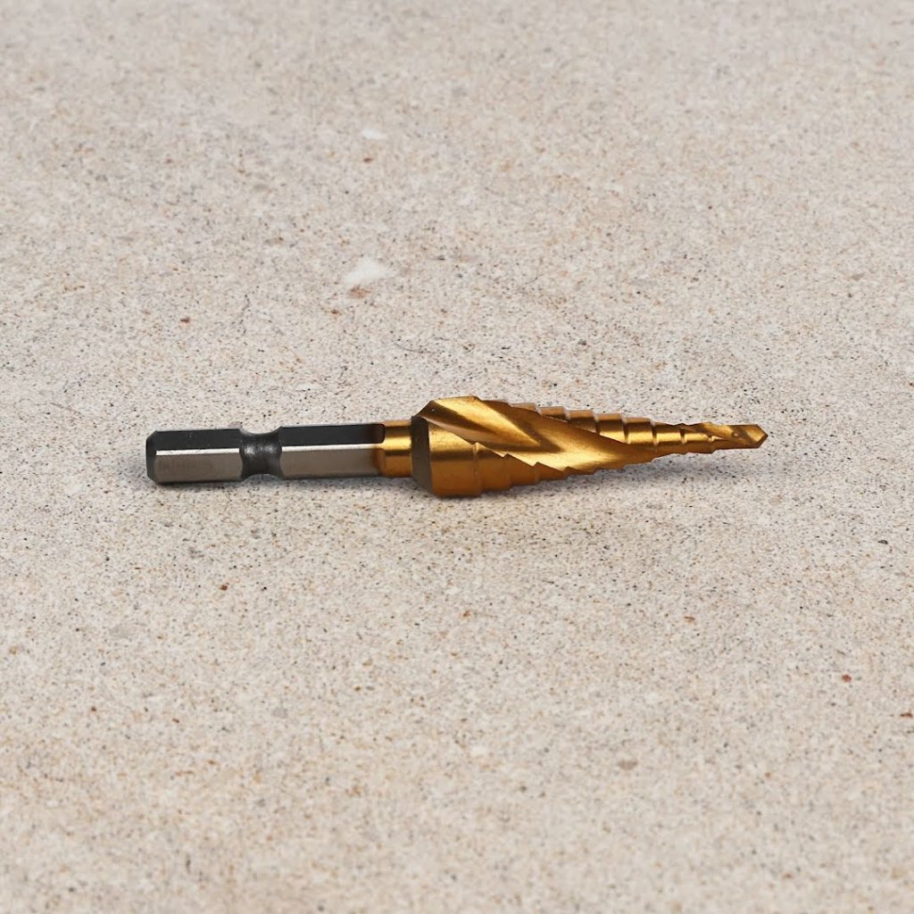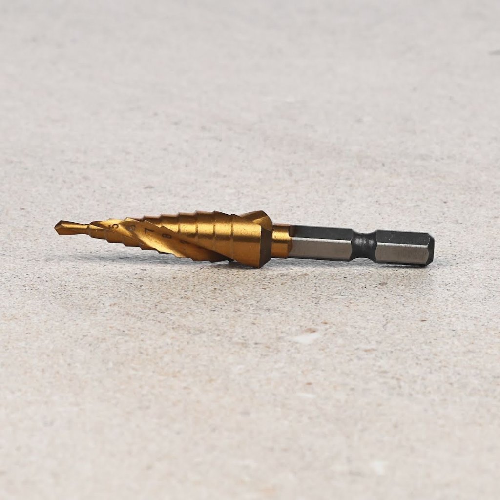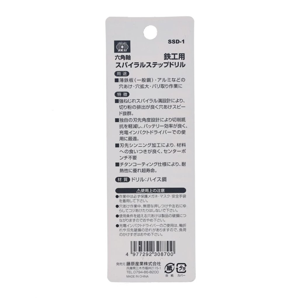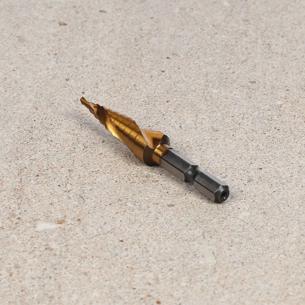 Titanem potažený stupňovitý vrták SK11, model SSD-1, je navržen pro efektivní vrtání v tenkých ocelových plechách a hliníku. Jeho unikátní spirálový design drážek zajišťuje vynikající odvod třísek a rychlé vrtací rychlosti. Titanový povlak poskytuje vynikající odolnost vůči teplu a dlouhou životnost. Tento vrták je ideální pro použití s akumulátorovými rázovými utahováky a vrtačkami, nabízí snížený řezný odpor a zlepšenou efektivitu baterie. Vhodný pro zvětšování otvorů a odstraňování otřepů. Má šestihrannou stopku 6,35 mm a zvládne materiály do tloušťky 2 mm.