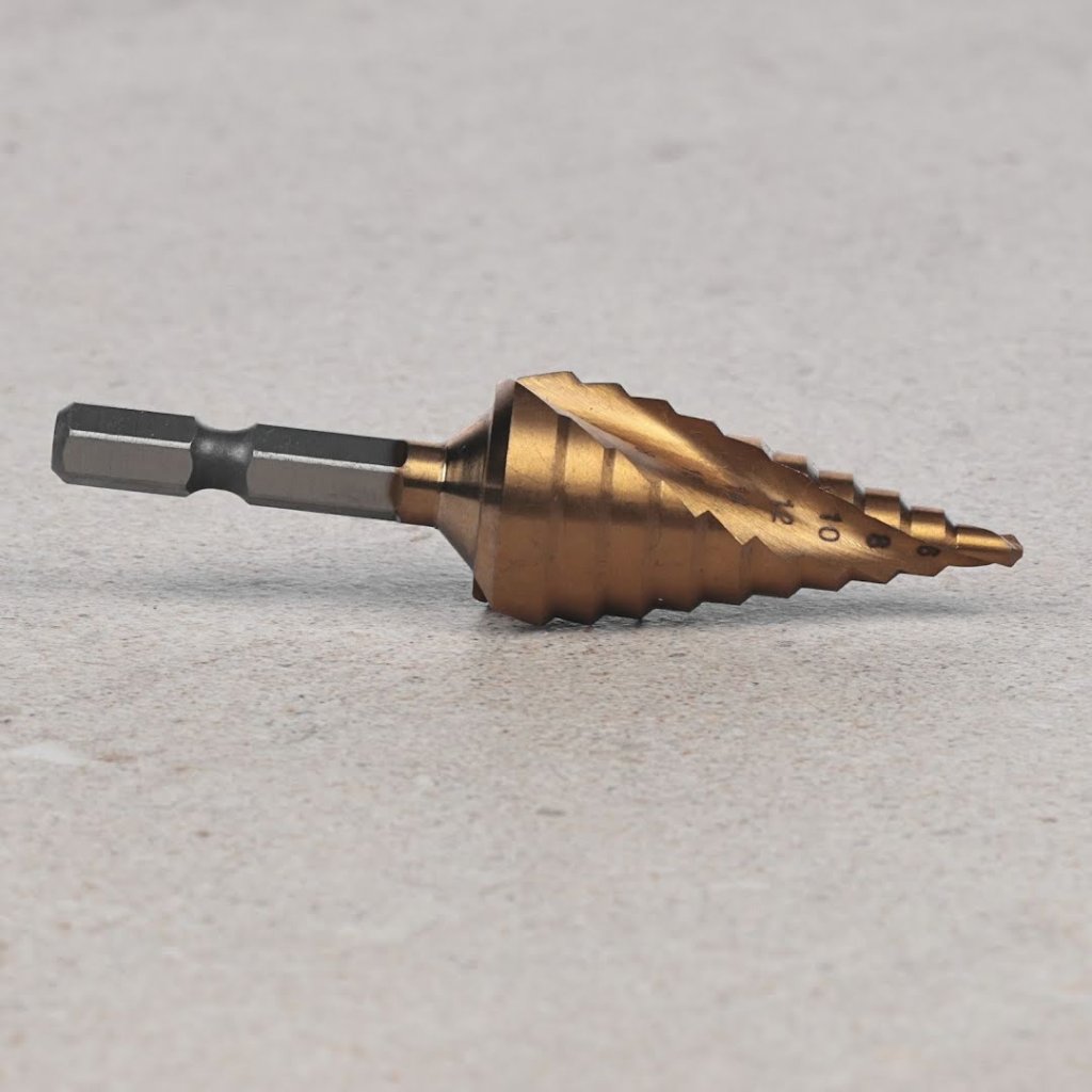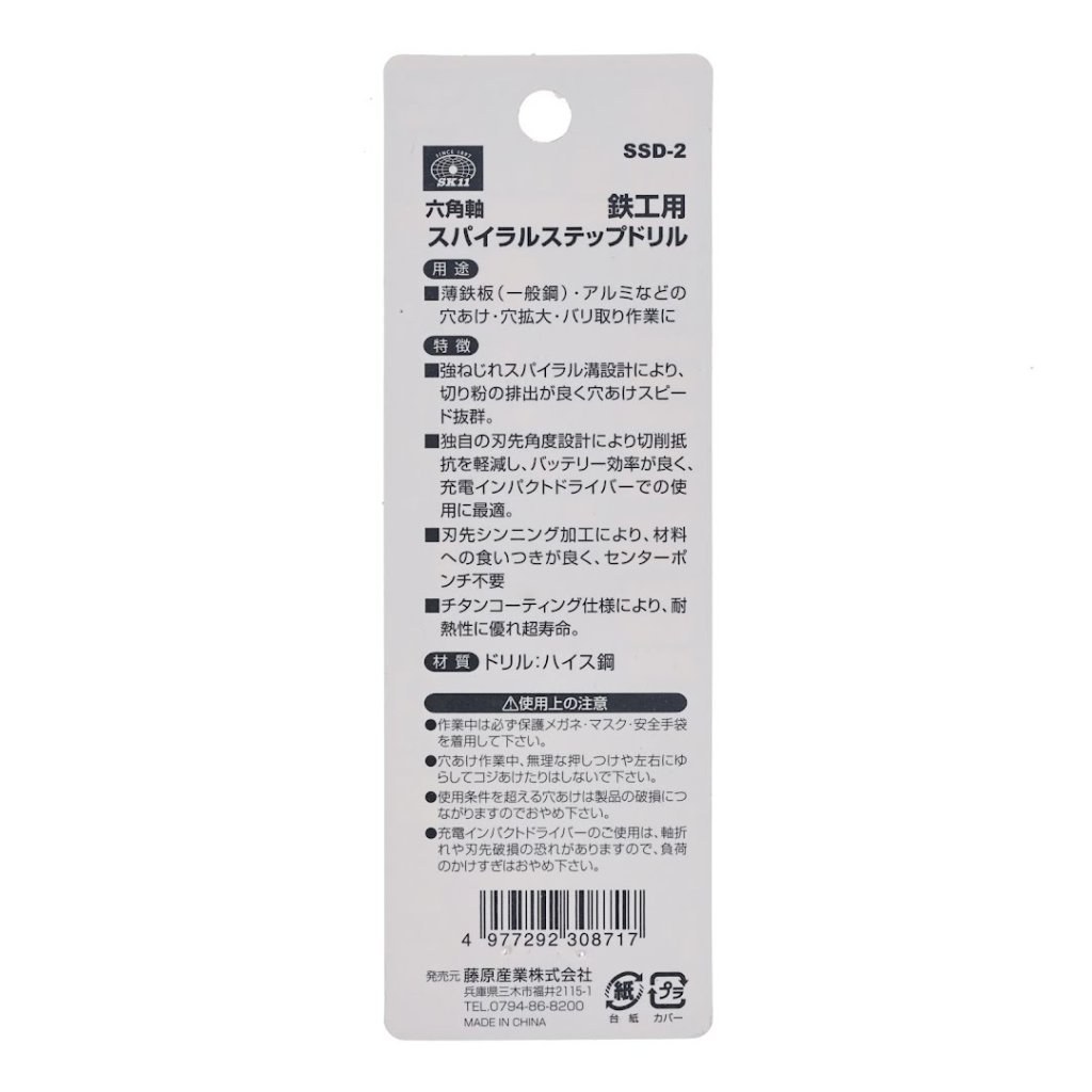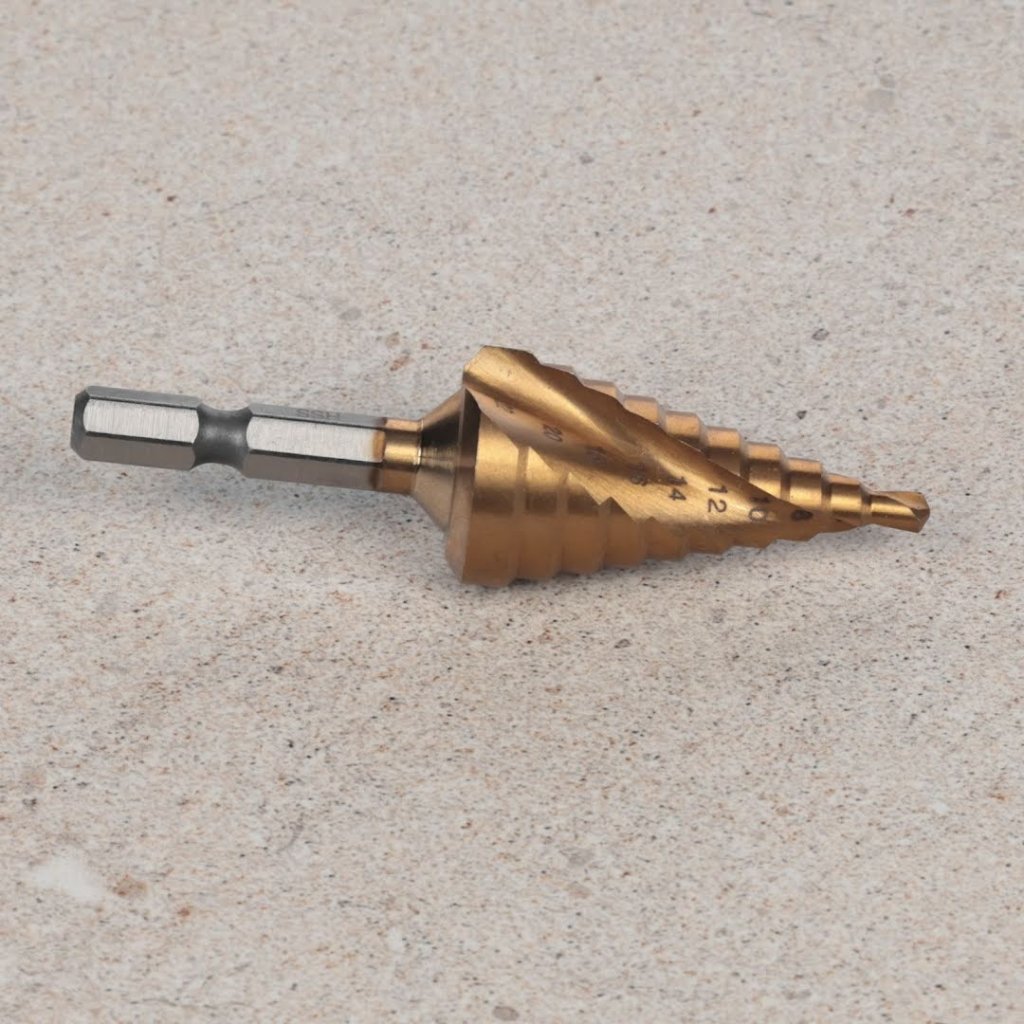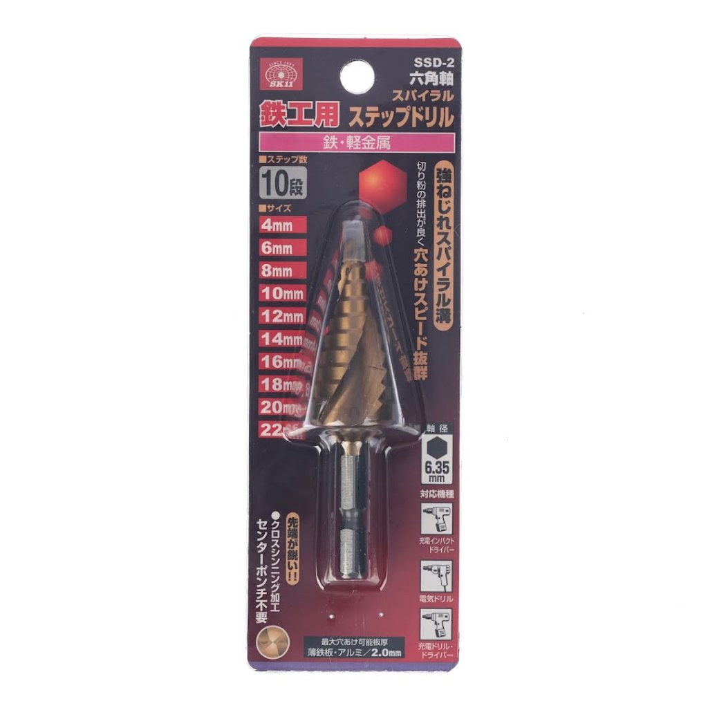 Titanem potažený stupňovitý vrták SK11, model SSD-2, je navržen pro efektivní vrtání v tenkých ocelových plechách a hliníku. Jeho unikátní spirálový design drážek zajišťuje vynikající odvod třísek a rychlé vrtací rychlosti. Titanový povlak poskytuje vynikající odolnost vůči teplu a dlouhou životnost. Tento vrták je ideální pro použití s akumulátorovými rázovými utahováky a vrtačkami, nabízí snížený řezný odpor a zlepšenou efektivitu baterie. Vhodný pro zvětšování otvorů a odstraňování otřepů. Má šestihrannou stopku 6,35 mm a zvládne materiály do tloušťky 2 mm.