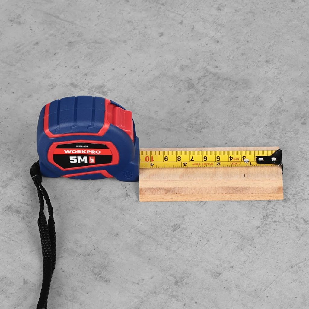 Svinovací metr WORKPRO s metrickou stupnicí s celkovým návinem 5 m. Metr disponuje pojistkou pro držení naměřené vzdálenosti, provázkem pro zavěšení, klipsem na opasek a výraznými barvami pro snadnou identifikaci v dílně i na staveništi.