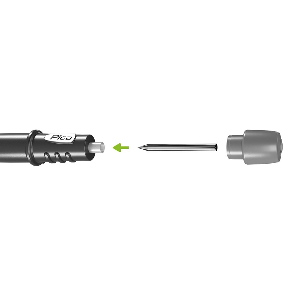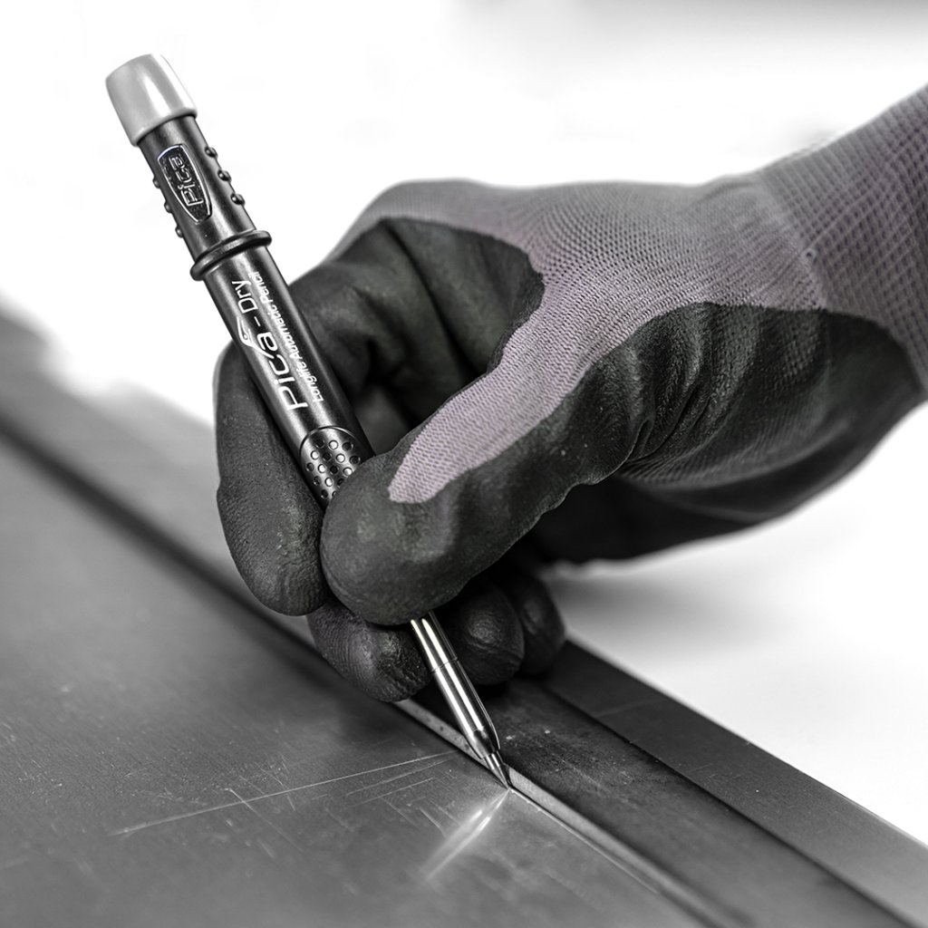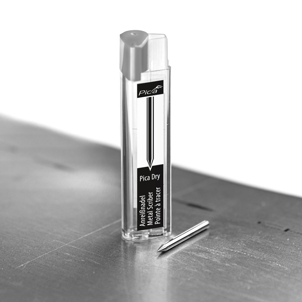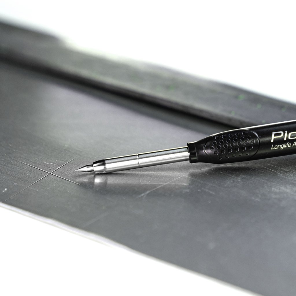 Rýsovací jehlu snadno vyměníte za grafitovou tuhu a můžete tak popisovat mnohem více povrchů. Multifunkční popisovač od Pica.