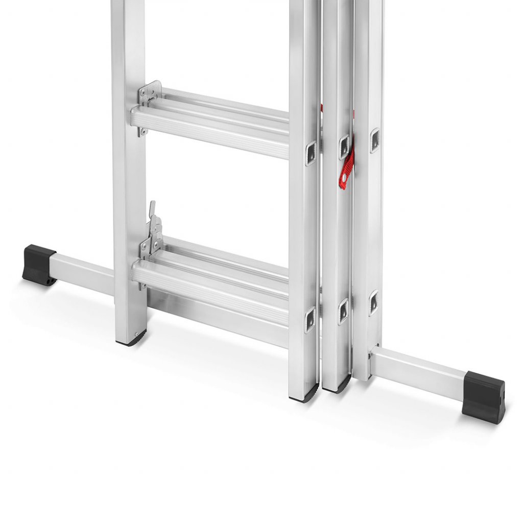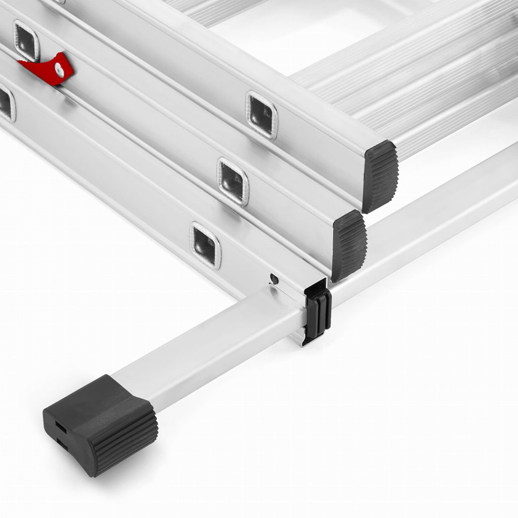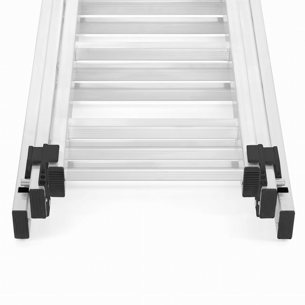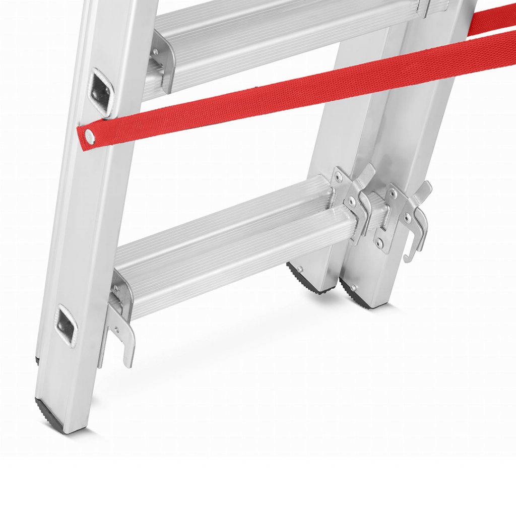 Široký a robustní profil tohoto žebříku zaručí bezpečnost při každodenní práci. Tato řada žebříků kombinuje nízkou cenu s vysokou kvalitou zpracování. Žebřík lze sestavit do několika různých konstrukcí dle potřeby. Vysoký pracovní rozsah. Tuhá a pevná konstrukce. Široký stabilizátor poskytne adekvátní ochranu proti naklonění do strany a je spolehlivou oporou pro celou konstrukci žebříku. Konce žebříku jsou opatřeny protiskluzovými patkami. Žebřík disponuje ocelovými bezpečnostními zarážkami pro adekvátní spojení svých jednodílných konstrukcí. Protichůdné konstrukce spojuje bezpečnostní popruh z prošívaného nylonu nýtovaný k bočnímu profilu žebříku.