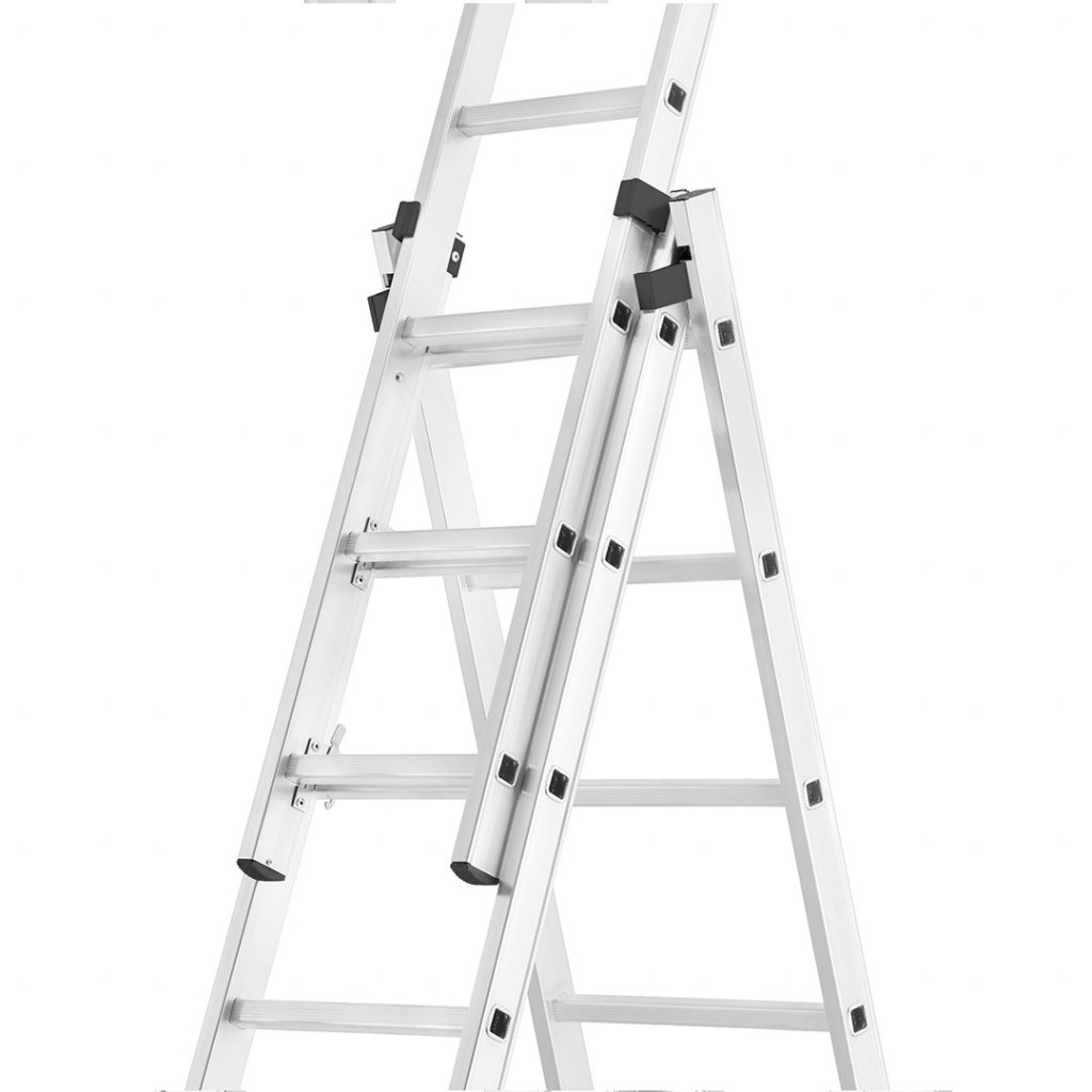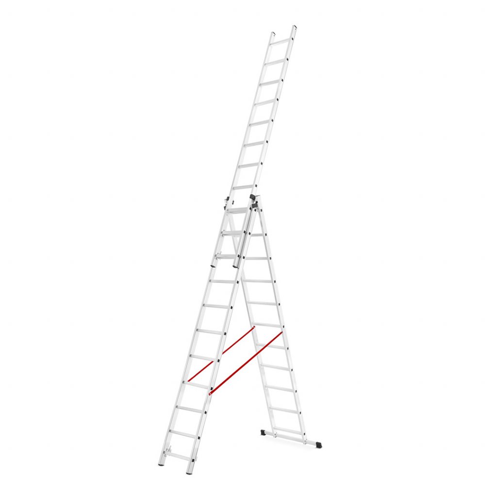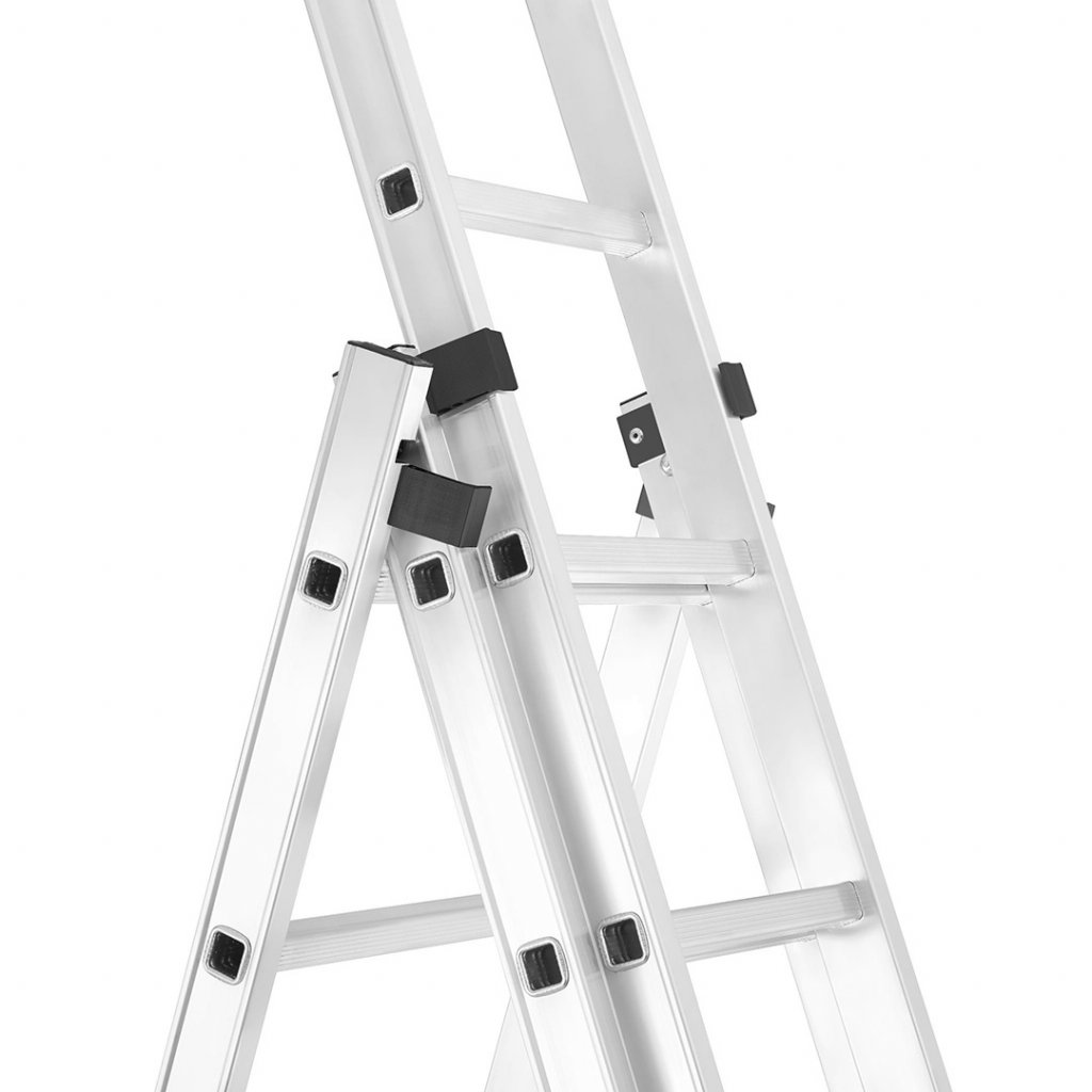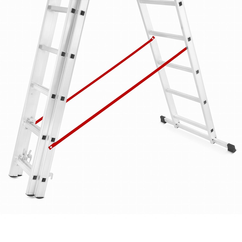 Široký a robustní profil tohoto žebříku zaručí bezpečnost při každodenní práci. Tato řada žebříků kombinuje nízkou cenu s vysokou kvalitou zpracování. Žebřík lze sestavit do několika různých konstrukcí dle potřeby. Vysoký pracovní rozsah. Tuhá a pevná konstrukce. Široký stabilizátor poskytne adekvátní ochranu proti naklonění do strany a je spolehlivou oporou pro celou konstrukci žebříku. Konce žebříku jsou opatřeny protiskluzovými patkami. Žebřík disponuje ocelovými bezpečnostními zarážkami pro adekvátní spojení svých jednodílných konstrukcí. Protichůdné konstrukce spojuje bezpečnostní popruh z prošívaného nylonu nýtovaný k bočnímu profilu žebříku.