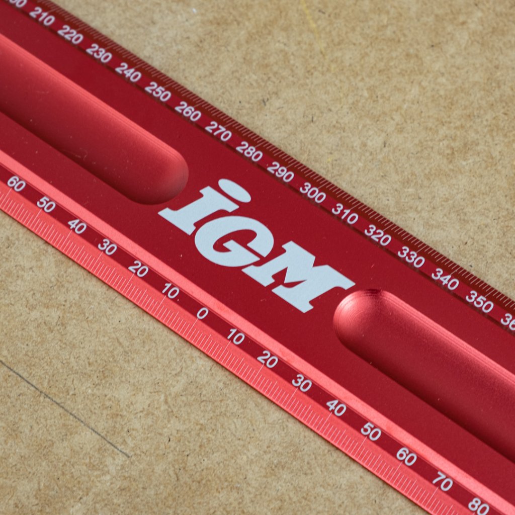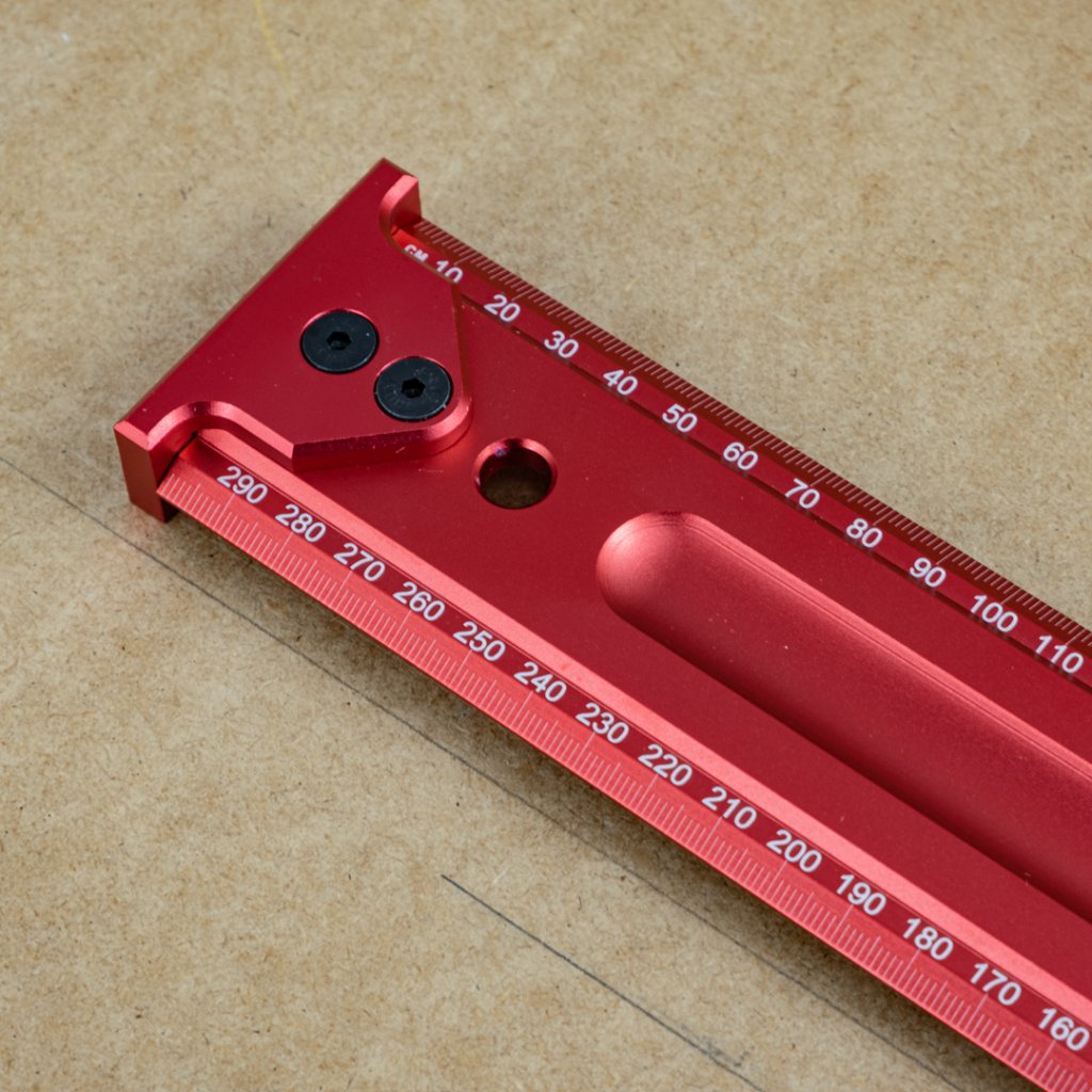 Duralové eloxované pravítko, odolné proti opotřebení a korozi. Dvě stupnice, jedna klasická a druhá s nulou uprostřed. Masivní, tuhá konstrukce pravítka. Doraz je možné namontovat na oba konce pravítka. Vylaserovaná stupnice zaručuje přesnost a její zkosení usnadňuje rýsování tužkou. Na jedné straně je klasická stupnice 0 – 600 mm, na druhé straně začíná 0 ve středu pravítka a stupnice je vpravo i vlevo do 300 mm. Otvory na konci pravítka slouží k upevnění dorazu, abyste dosáhli vysoké přesnosti při rýsování kolmo k hraně dílce. Prolisy v těle pravítka usnadňují manipulaci a posun pravítka prsty po ploše. Materiál ze slitiny hliníku je odolný proti opotřebení a korozi. Rozměry: 600 x 56 x 20 mm.