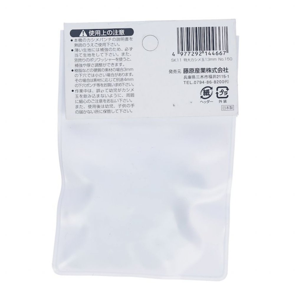 SK11 velké nýty, č.150, jsou navrženy pro použití s extra velkými děrovači pro oka SK11 č.1500 a č.1550, což je ideální volba pro zesílení a opravy pásků, tašek, ledvinek, kapsářů na nehty a školních tašek. Každá sada obsahuje 20 párů 13 mm nýtů, což zajišťuje dostatek pro více projektů. Tyto nýty jsou ideální pro materiály s tloušťkou 4,0 až 6,5 mm, průměrem hlavy 13 mm a délkou nožky 10 mm. Pro tenčí materiály se doporučuje použít podkladovou textilii nebo volitelnou podložku č.180 pro zesílení a úpravu tloušťky.