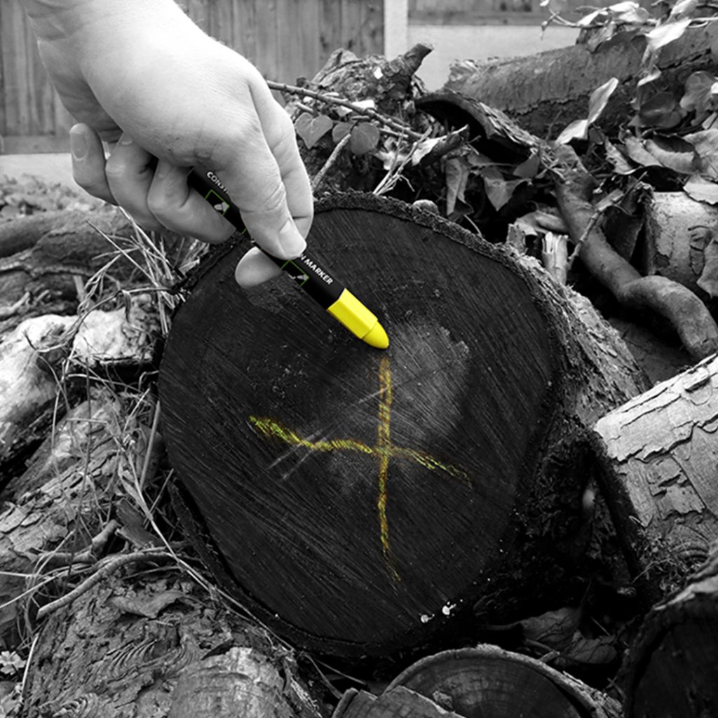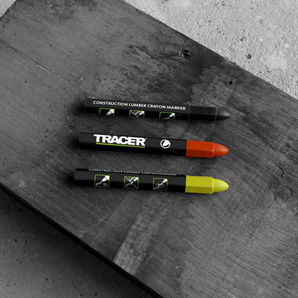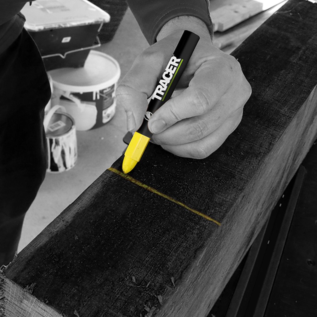 Tyhle robustní tužky od firmy TRACER se dobře drží i v pracovních rukavicích - jsou dost široké a mají hrany jako kovový krajon. Základní žlutá barva, která dobře přilne k mnoha povrchům za sucha i za mokra.