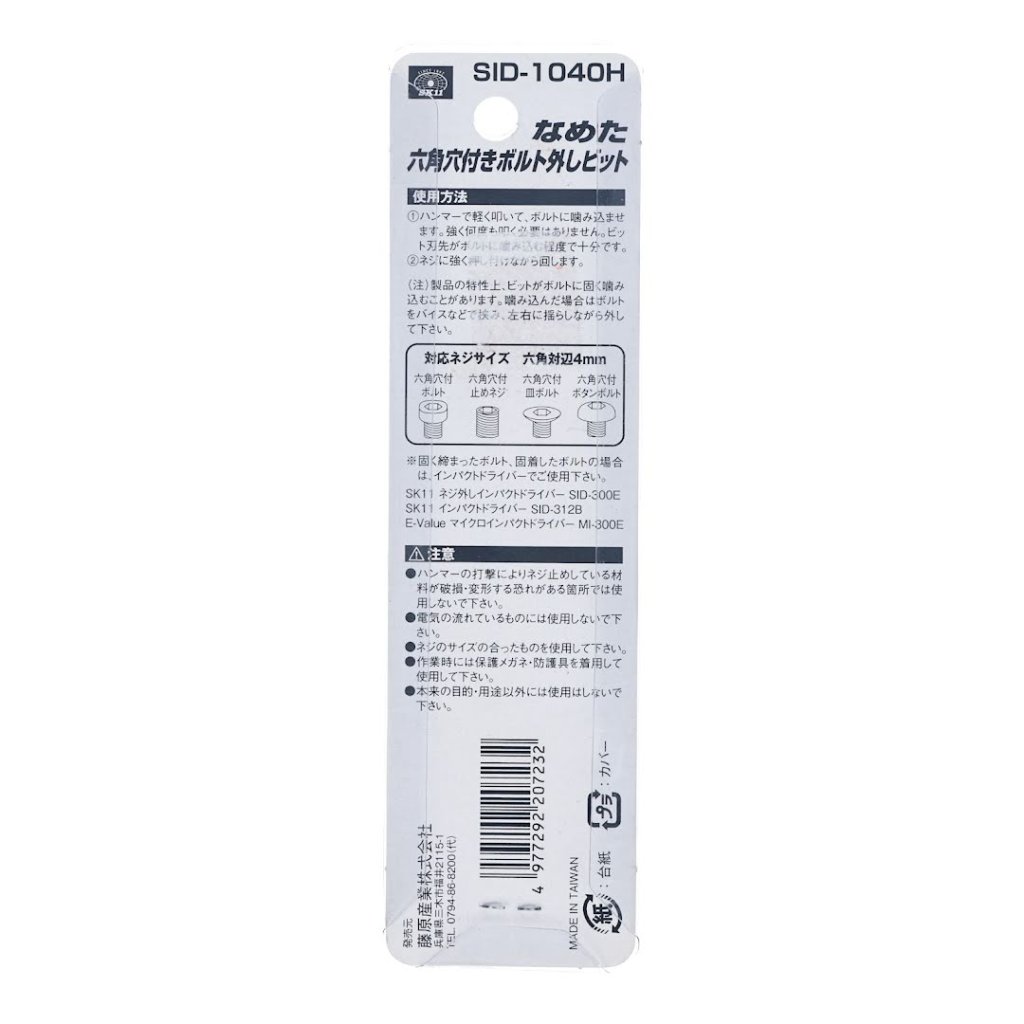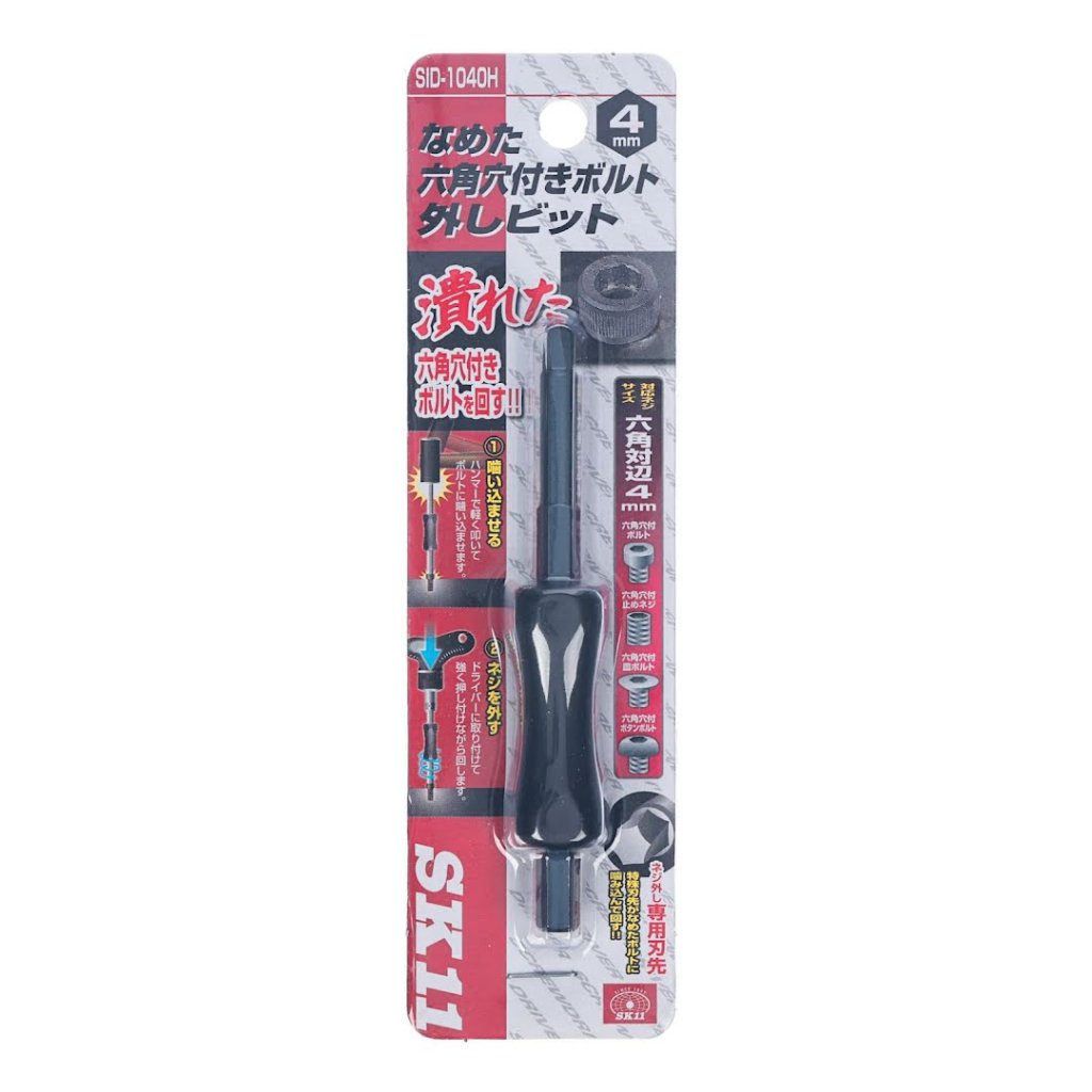 Vytahovací bit SK11, model SID-1040, je navržen pro odstraňování šroubů s vnitřním šestihranem, které nelze otáčet standardním šestihranným klíčem. Díky jedinečnému tvaru čepele tento bit pevně uchopí poškozené šrouby a zajistí jejich efektivní odstranění. Je kompatibilní s velikostí šestihranu 4 mm a má kompaktní design. Ideální pro domácí kutily i profesionály.