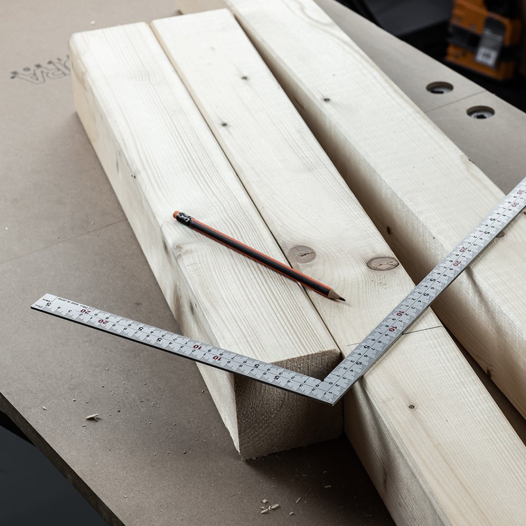 Praktický nerezový úhelník s metrickou stupnicí 50 cm. Díky očku zavěsíte kdekoliv v dílně.