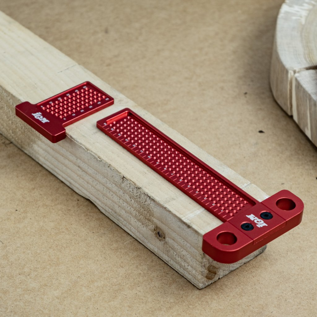 Malé kompaktní značící pravítko pro rýsování dokonale rovnoběžných čar podle hrany materiálu. Rychlé a přesné rýsování rovnoběžných čar ve vzdálenosti 5 - 60 mm. Kompaktní rozměr, vejde se do každé kapsy. Vložte tužku do odpovídajícího otvoru a vytvořte rovnoběžnou čáru posouváním pravítka po hraně dílce. Rovnoběžnou čáru můžete rýsovat ve vzdálenosti 5 až 60 mm od hrany dílce. Každý otvor představuje 1 mm. Materiál ze slitiny hliníku je odolný proti opotřebení a korozi. Příložník je vhodný pro tuhy 0,5–1 mm. Rozměry: 80 x 58 x 9 mm.
